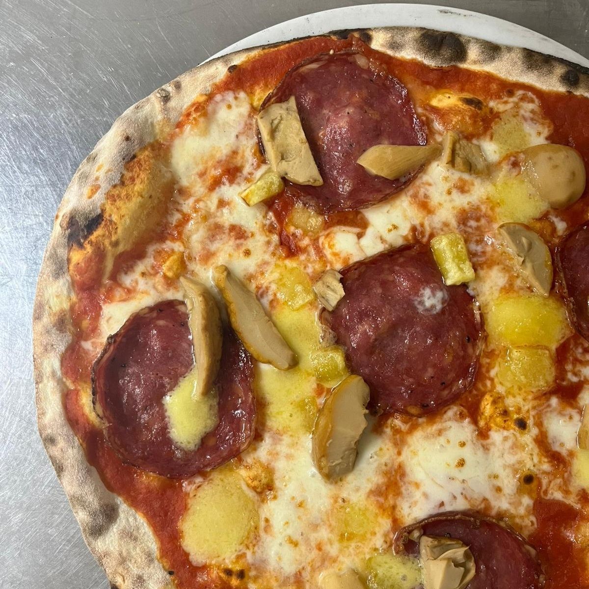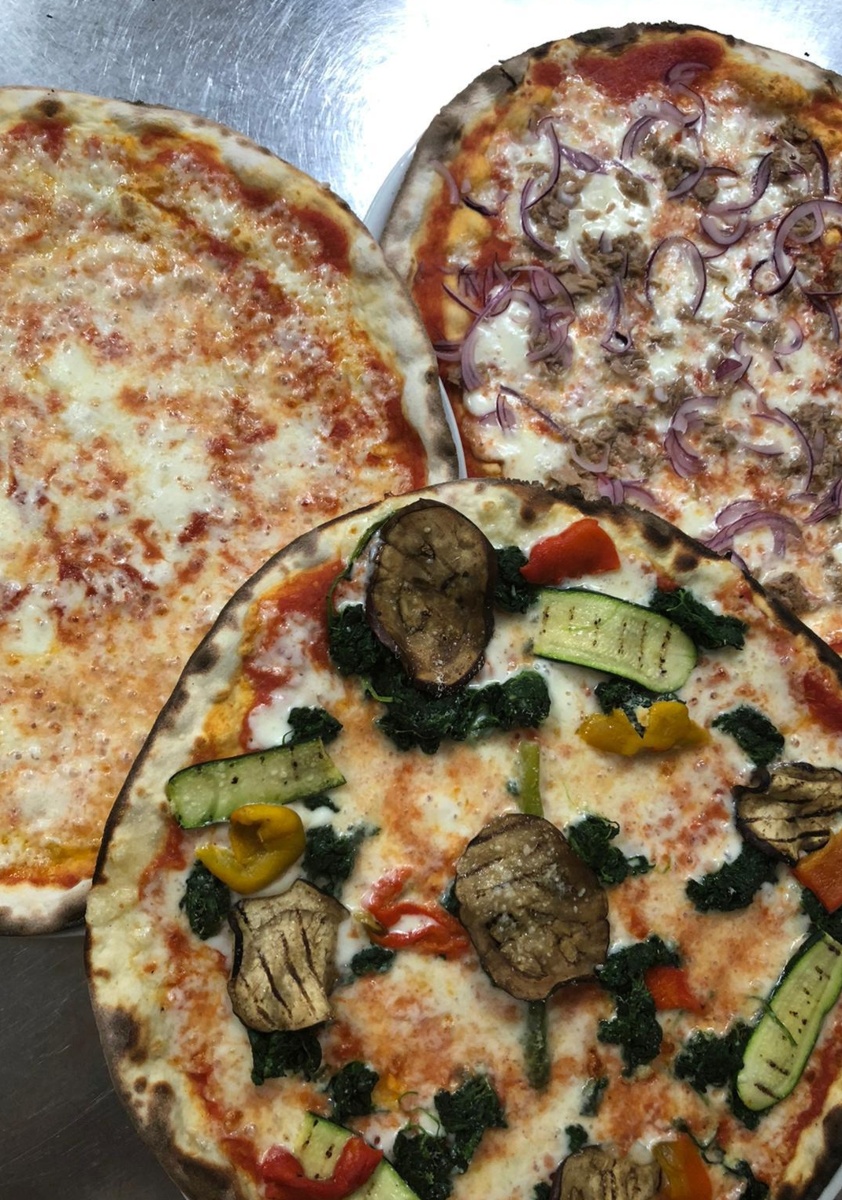 La filosofia è chiara: selezionare prodotti locali quando possibile, senza rinunciare a eccellenze italiane. Nascono così pizze come la cacio e pepe con pecorino di una piccola azienda sarda, o l’amatriciana con pancetta cotta prodotta in esclusiva dal macellaio locale di fiducia, grana e pecorino.