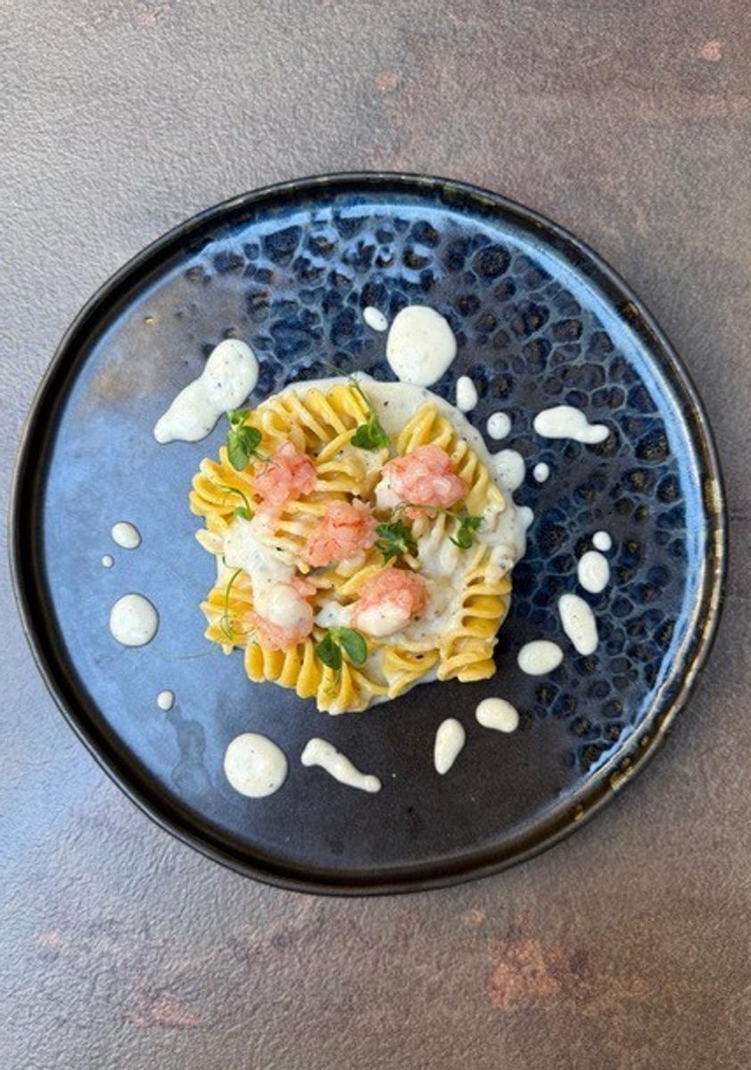 Fusillone cacio e pepe con tartare di gamberi: un signature dish che rappresenta appieno la filosofia della cucina di «Hortus».