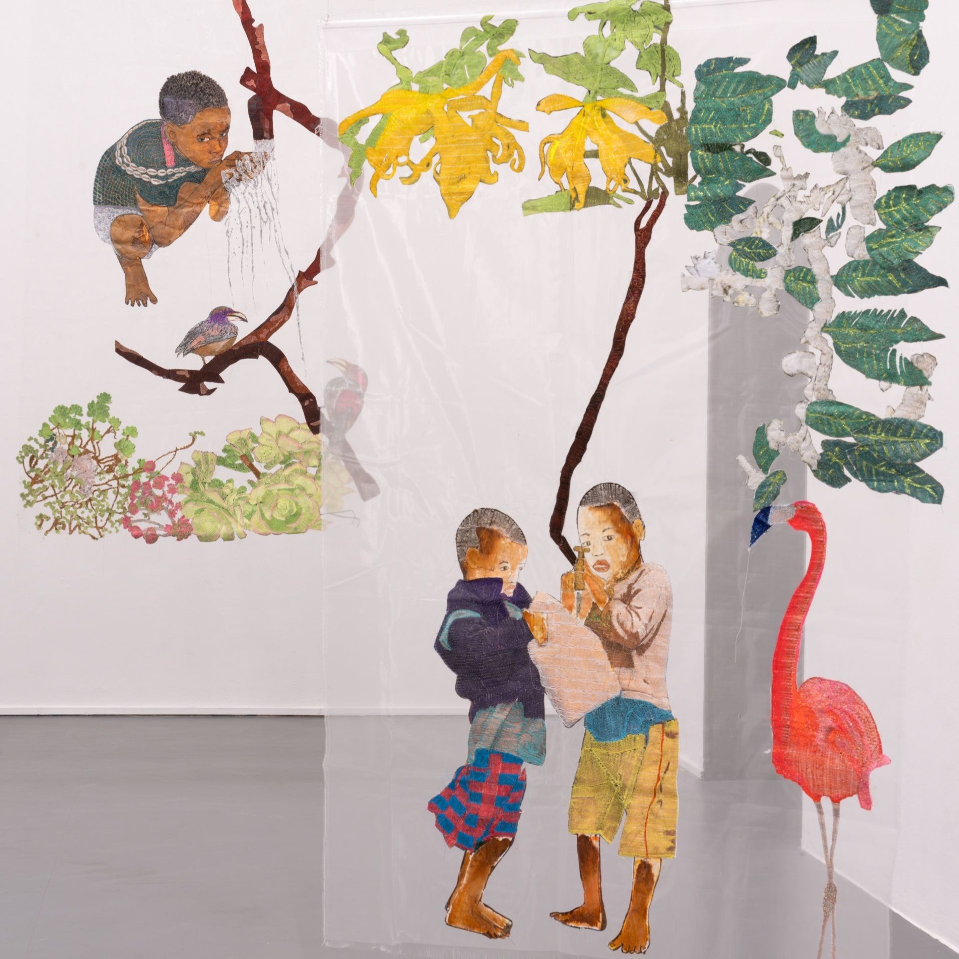 Accanto ai lavori più recenti, la mostra ripercorre alcuni capitoli fondamentali della ricerca dell’artista, come la serie «O Fardo / Vestir Memórias». Qui il supporto è costituito dai grandi sacchi in plastica e rafia utilizzati per trasportare abiti usati dall’Europa ai mercati africani. Contenitori di vestiti e insieme di storie invisibili, questi sacchi raccontano gli squilibri di un sistema economico che riversa nel Sud globale le eccedenze del Nord, generando dipendenze e nuove forme di sfruttamento ambientale. Trasformandoli in superfici narrative attraverso cuciture e inserti figurativi, l’artista compie un gesto di riappropriazione poetica e politica: ciò che era destinato allo scarto diventa archivio di memoria e strumento di consapevolezza critica. L’ecologia proposta da Silva è relazionale e sistemica. Non riguarda solo l’ambiente naturale, ma le connessioni tra corpi, merci, territori, eredità coloniali ancora operative e flussi transcontinentali. Vivendo tra Angola, Portogallo e Brasile, l’artista incarna una condizione mobile che si riflette nelle sue opere: migrazioni, attraversamenti, stratificazioni culturali. In questo senso «Eau» dialoga con le sfide poste dalla globalizzazione e dal consumo accelerato, invitando a ripensare il concetto stesso di progresso alla luce della responsabilità collettiva.