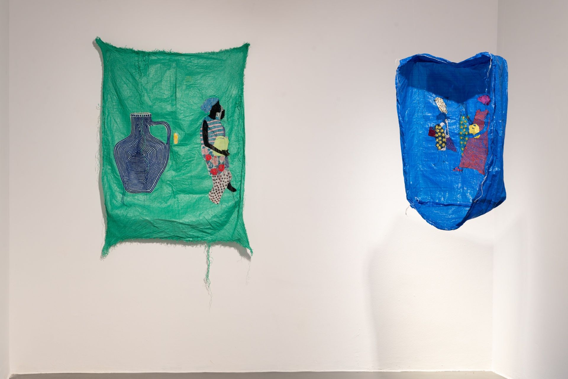 Il risultato è un dialogo tra produzione industriale e gesto artigianale, tra economia globale e cura individuale: una tensione che si percepisce fisicamente nelle superfici stratificate delle opere. Il cuore green della mostra non si limita ai contenuti, ma attraversa i materiali. I tessuti scelti sono infatti spesso stoffe industriali prodotte in massa per i mercati africani: pattern geometrici, colori accesi, superfici pensate per una circolazione rapida e un consumo altrettanto rapido. Una volta superati dal mercato, questi tessuti diventano eccedenza, scarto nelle case e nei magazzini. L’artista si inserisce in questa traiettoria e la devia: recupera, riutilizza, ricuce, trasformando il rifiuto in risorsa. Sostenibilità, qui, è un modo prolungare la vita degli oggetti e rimettere in circolo storie sommerse, saperi marginalizzati, economie invisibili. Le figure femminili che abitano le opere appaiono talvolta incomplete, attraversate da fili lasciati a vista, immerse in trame che richiamano la ripetizione industriale. Sono corpi in divenire, vulnerabili e insieme resistenti, che sfuggono a un’identità univoca. Intervenendo sui pattern seriali, Silva introduce una pausa, un’interruzione critica: è lo spazio in cui la mano riafferma la propria presenza contro l’anonimato della produzione di massa e contro l’idea che tutto debba essere perfettamente rifinito, chiuso, consumabile.