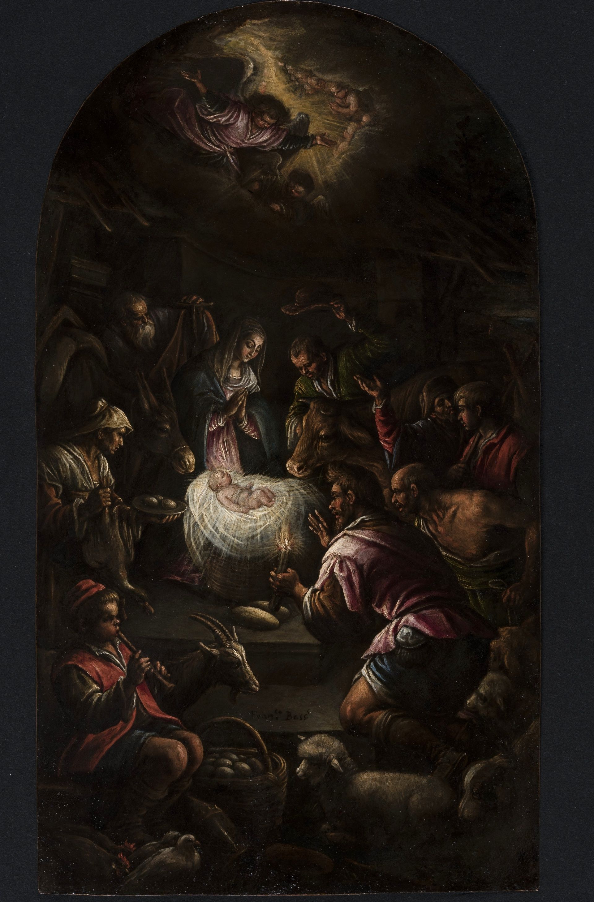 Bassano, formato nella bottega di famiglia e abituato fin da giovane allo studio della teatralità della luce e del chiaroscuro, costruisce l’immagine come un teatro in miniatura. Sul rame il colore vibra diversamente: più compatto, come se la superficie stessa costringesse la scena a una misura intima. Gli angeli sospesi in alto, appena toccati dal chiarore, ricordano le Sacre Rappresentazioni che animavano le confraternite tra Cinquecento e primo Seicento, quando l’uso delle candele e delle torce aveva già acquisito un valore narrativo. In quel mondo teatrale la luce non era un fatto scontato: decideva cosa mostrare e cosa lasciare in ombra, costruendo gerarchie visive. Era uno strumento narrativo prima ancora che tecnico.