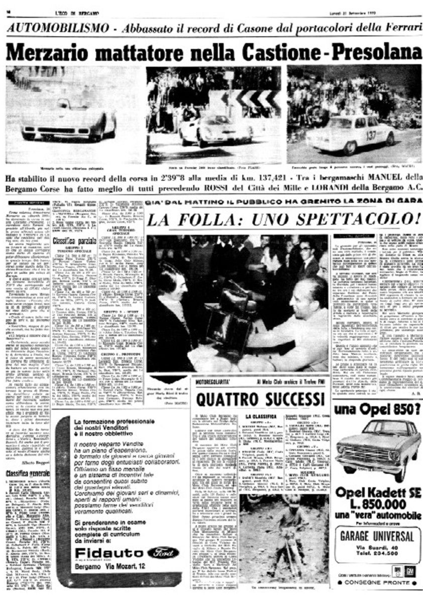 La «Dezzo-Presolana» e la «Castione-Presolana» segnarono il passaggio dalla formula mista della regolarità-velocità delle prime edizioni alla cronoscalata pura. Il ciclo si concluse con la vittoria di Arturo Merzario su Abarth 3000. Sulle pagine de L’Eco di Bergamo del 21 settembre 1970 si legge che «il pilota comasco, sia pur dolorante al polso per un incidente in gara la domenica precedente, coprì i sei chilometri del tortuoso tracciato in soli 2’39”8, alla velocità media di 137,421 km/ora».