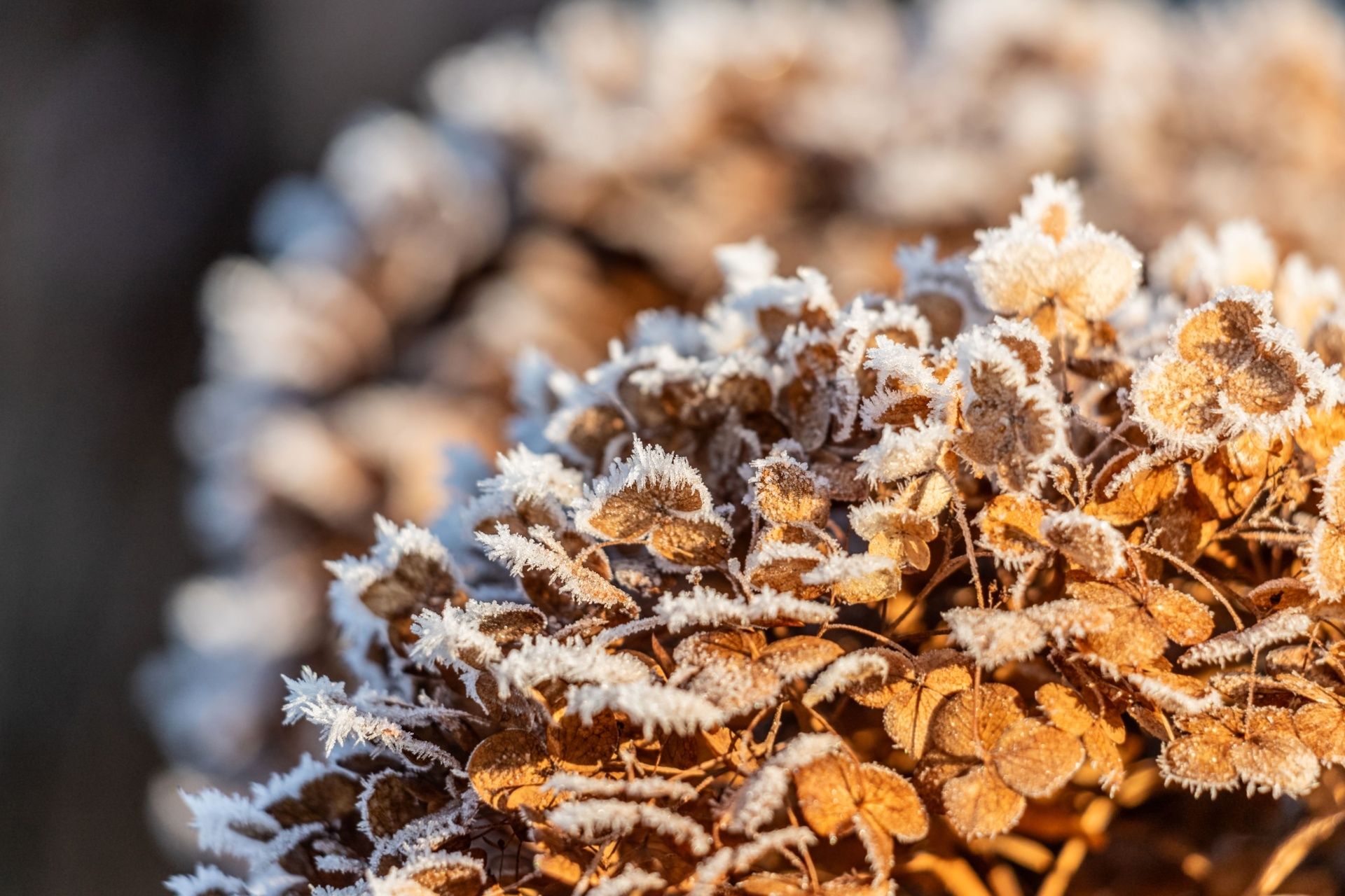 Il giardino d’inverno contemporaneo non celebra il verde intenso né la fioritura, ma la bellezza dell’appassire. Le forme diventano essenziali, i colori si smorzano in una tavolozza di ocra, bronzo, argento e rosso cupo. Le ortensie dorate (Hydrangea paniculata, Hydrangea macrophylla) conservano nei petali secchi la luce dell’estate; i cardi argentati (Eryngium giganteum) si ergono come sculture metalliche; i rami rossi dei cornus (Cornus alba, Cornus sanguinea) tagliano la nebbia come fiamme vegetali. Accanto a loro, le graminacee ornamentali — Miscanthus sinensis, Pennisetum alopecuroides, Panicum virgatum — ondeggiano al vento, disegnando architetture leggere che catturano la brina del mattino. Tutto vive in sottrazione, ma nulla è assenza: ogni pianta è una linea, una memoria, una promessa.