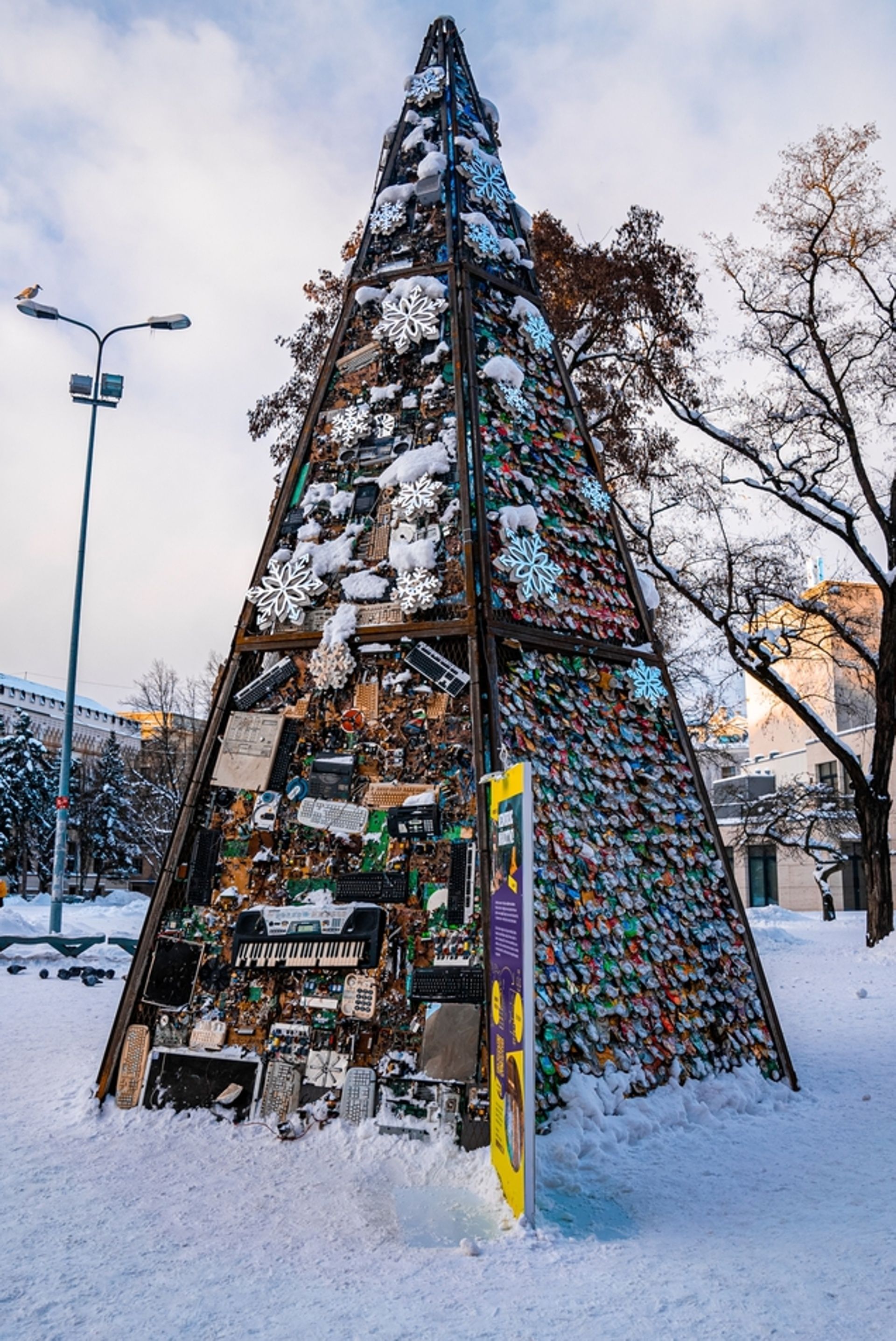 Uscendo dai confini nazionali, un esempio particolarmente virtuoso: nel 2021, Riga, in Lettonia, ha esposto nella piazza Līvu un albero di Natale ecologico alto 9 metri, creato dallo scultore Haralds Geerts e dall’azienda di riciclaggio Clean R utilizzando vari rifiuti elettronici e materiali riciclabili (bottiglie di plastica, pneumatici, dispositivi elettronici) per promuovere un consumo responsabile e una riduzione.
