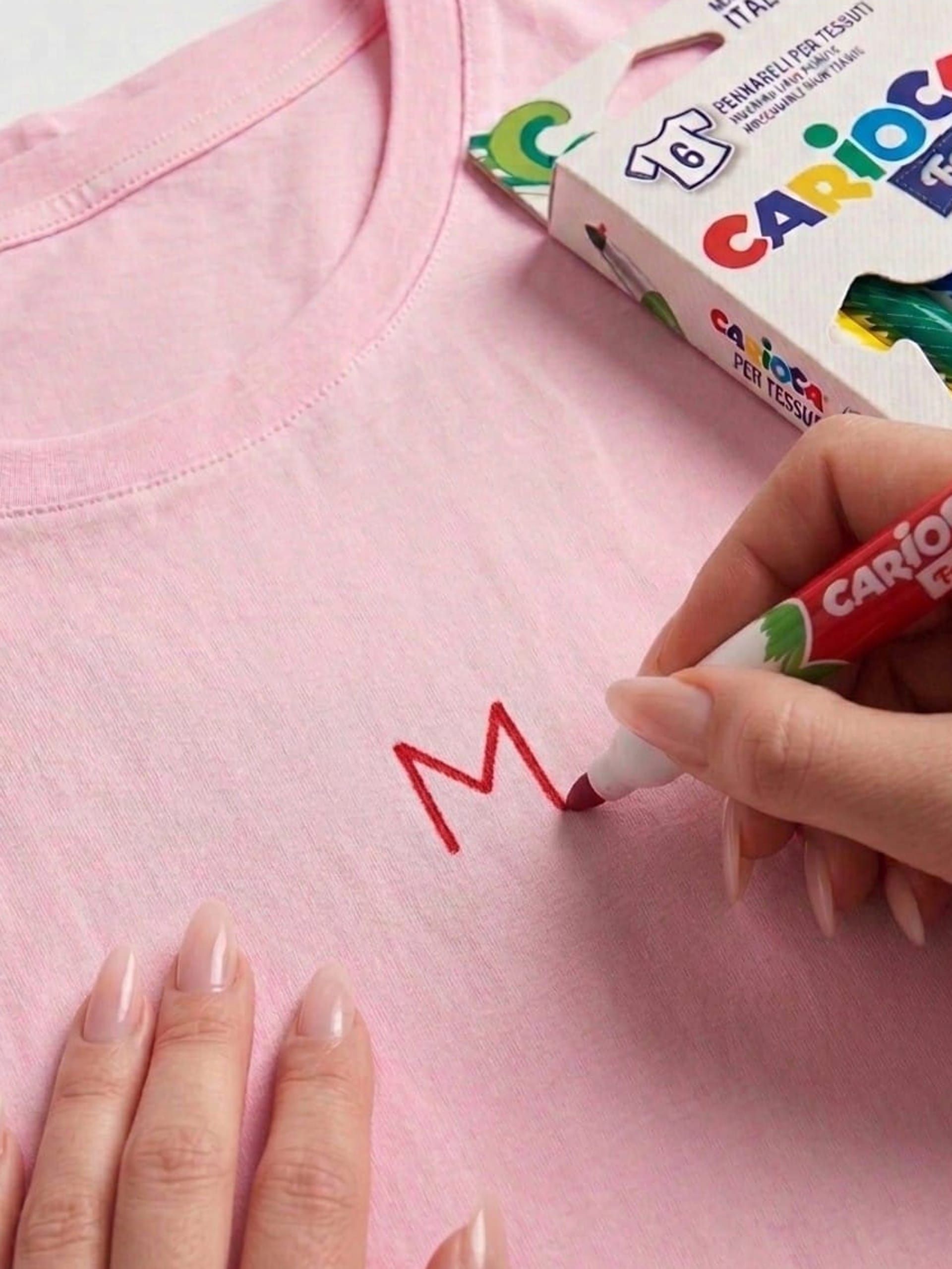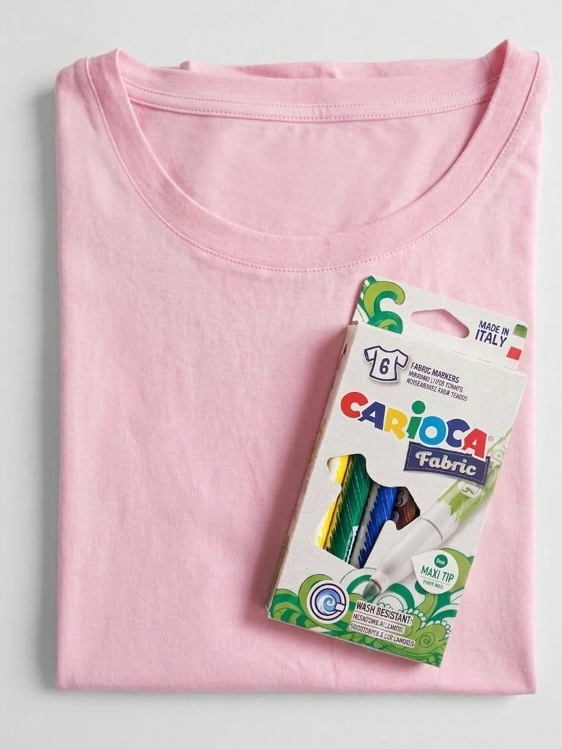 - Maglietta in cotone di colore chiaro. Ho scelto una semplice t-shirt rosa confetto 100% cotone. Meglio evitare tessuti sintetici e troppo elasticizzati perché non garantiscono una buona resa o tenuta delle scritte che andremo a fare.
