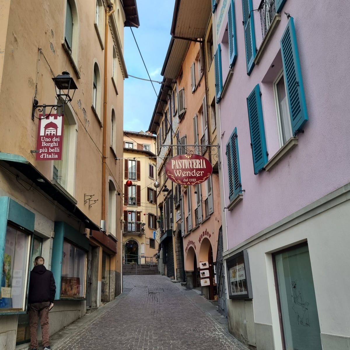I nostri zaini sono osservati speciali: in effetti poco c’entrano con l’eleganza della piazza centrale e le acque increspate del lago. I bar alzano le saracinesche e ci intrufoliamo in quello che pare aperto da più tempo: «Ecco dove sono tutti i loveresi!». Un buon caffè è quel che ci vuole. Riscaldati e ben colazionati, ci concediamo un giretto per le vie del centro storico: l’atmosfera del mattino loverese è morbidamente intrigante: palazzi signorili, torri massicce, antichi portali, chiese silenziose e scorci improvvisi sul lago, tutto ciò mette quiete nell’animo.