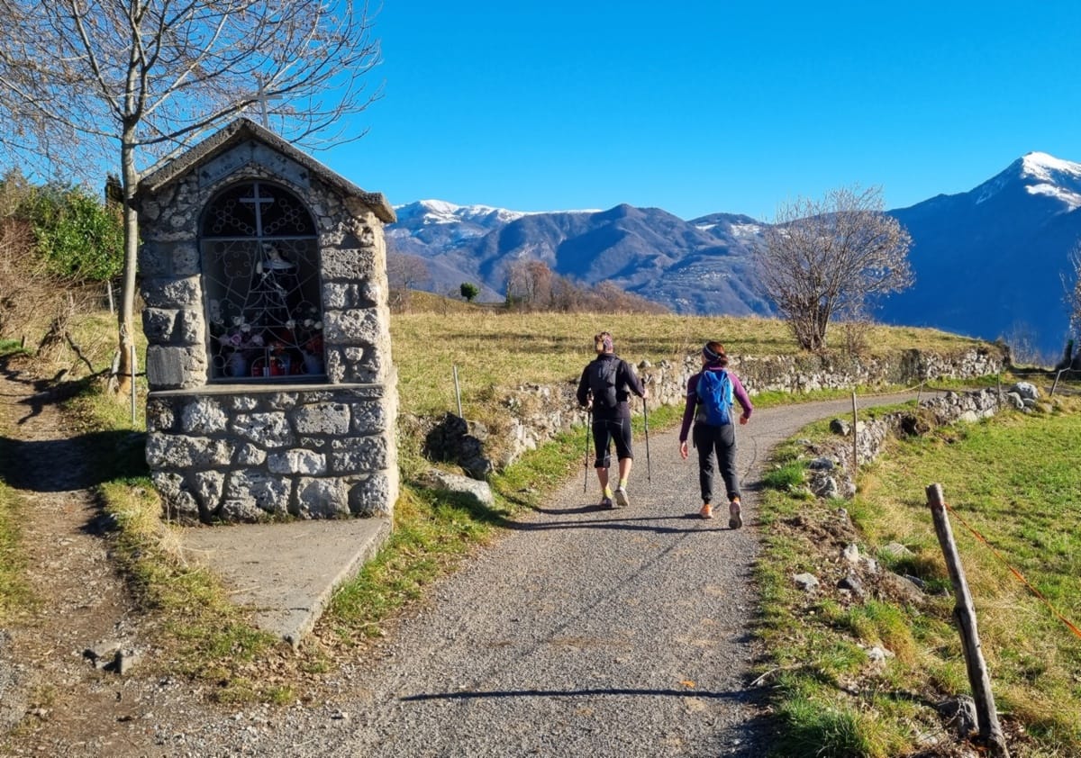 I monti e i borghi sopra Lovere sono già illuminati dal sole, un buon motivo per affrettare il cammino. Imbocchiamo via Davine e via Celeri che si inerpicano verso Qualino, prima contrada sul nostro cammino. Da Qualino si segue la vecchia ampia mulattiera che in più occasioni intercetta la strada provinciale. In questo tratto ci troviamo sulle tracce del «Cammino dei Tre laghi», un percorso di recente ideazione che in sei tappe tocca tre laghi orobici: Endine, Piangaiano e Sebino.