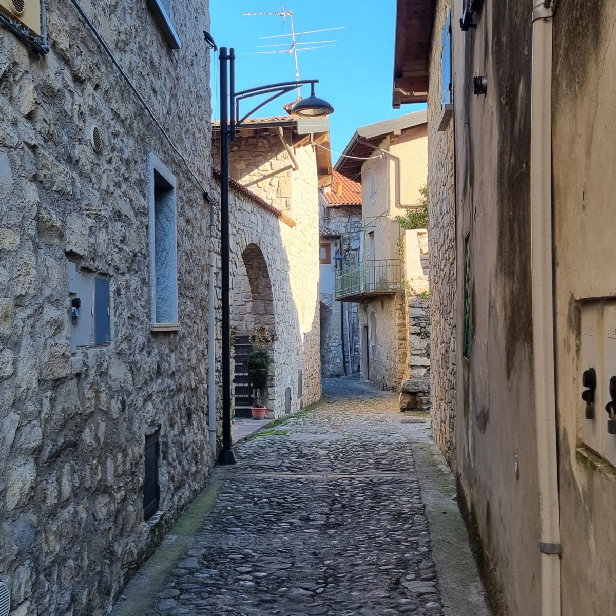 Dal Santuario esistono numerose vie per esplorare l’isola, scegliamo la più completa: seguiamo il sentiero 3 che, per comodo acciottolato, percorre il crinale Nord (in ombra in questa stagione). Poco prima del borgo di Cure, che abbiamo poc’anzi visitato, il sentiero devia a destra e prosegue la discesa in direzione di Masse, altro bel paesello posto su uno suggestivo terrazzo di prati e olivi con vista privilegiata sull’alto Sebino. Dimore di pietra con bei portali ad arco e strette viuzze con le immancabili motorette posteggiate ai lati. Ci abbassiamo di quota fino a Olzano, altro gioiellino rurale, per poi scendere al paese di Carzano, in riva al lago, sulla punta nordorientale di Monte Isola. Camminiamo per le vie di Carzano provando ad immaginare il tripudio di colori che caratterizza la « Festa di Santa Croce »: ogni cinque anni le vie e le case del borgo sono addobbate con innumerevoli fiori di carta realizzati dalle abili mani delle donne del paese. Occorrerà però attendere il 2030 per godere del prossimo spettacolo: quello dello scorso mese di settembre è stato una meraviglia.