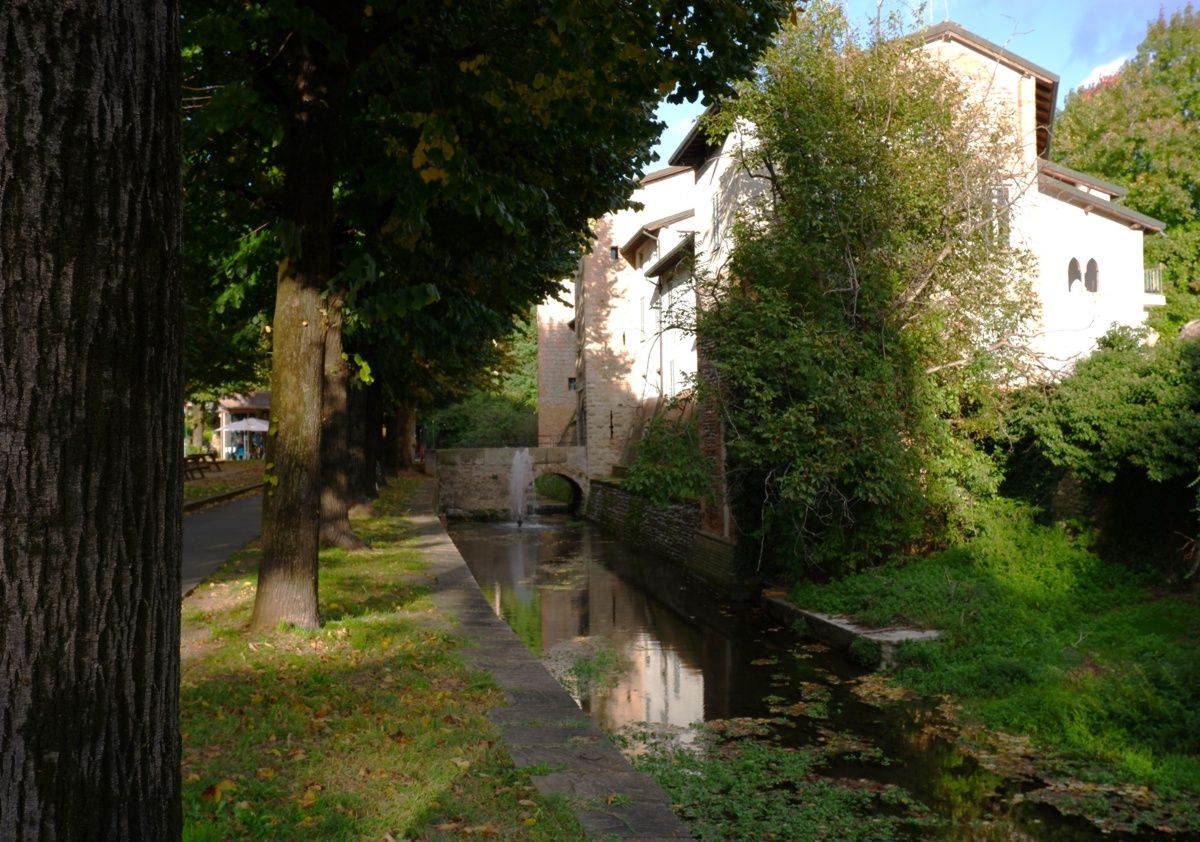 Mentre le nuvole si addensano, raggiungo Cologno al Serio, la mia meta di oggi, che ho deciso di visitare perché già in una precedente occasione la passeggiata che si sviluppa lungo l’antico fossato mi aveva affascinata. Il centro storico di Cologno è infatti circondato da un fossato, anche se pare che in passato fossero due i canali concentrici, molto più profondi di quello attuale, a proteggere l’antica cinta muraria. Oggi non ci sono più nemici a cui rendere estremamente difficile l’ingresso al paese, ma solo persone che passeggiano con tranquillità o approfittano del pomeriggio festivo per fare una corsetta. Il borgo ha quattro porte fortificate, una per ogni punto cardinale: porta Antignano a Est, porta Cassatica a Sud, porta Moringhello a Ovest e porta Rocca a Nord. La mia passeggiata a Cologno inizia proprio da qui, davanti alla porta che guarda in direzione di Bergamo, dove ancora si vedono i segni dell’antico ponte levatoio.