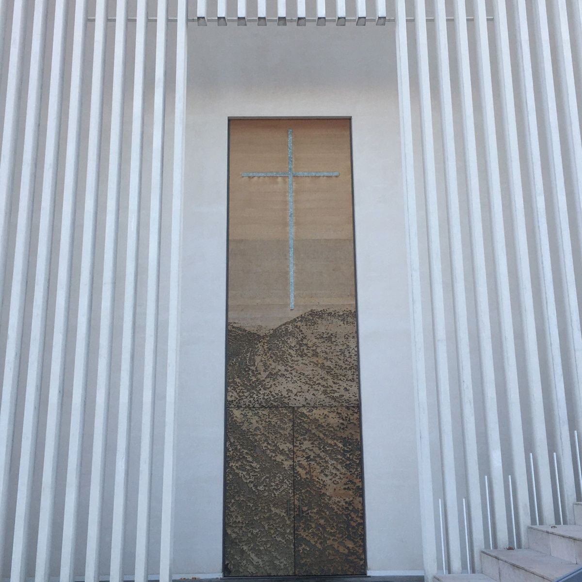 L’interno ha gli stessi colori, resi ancora più luminosi dal bianco dei marmi e dalla luce naturale che viene convogliata verso l’altare. Anche in questo caso, è vietato restare fuori, perché l’elemento sorprendente di questa chiesa è il soffitto: una cupola, sì, ma rovesciata. Colpiscono anche le linee pulite e ordinate del battistero e le tredici colonne che compongono l’altare. Tutti questi elementi danno a chi visita la chiesa una sensazione che si avvicina molto alla serenità di essere accolti da qualcuno a cui potersi affidare.