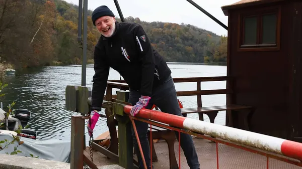 LA STORIA. Il sindaco di Imbersago, Fabio Vergani, al timone del traghetto che fa avanti indietro da una riva all’altra dell’Adda.