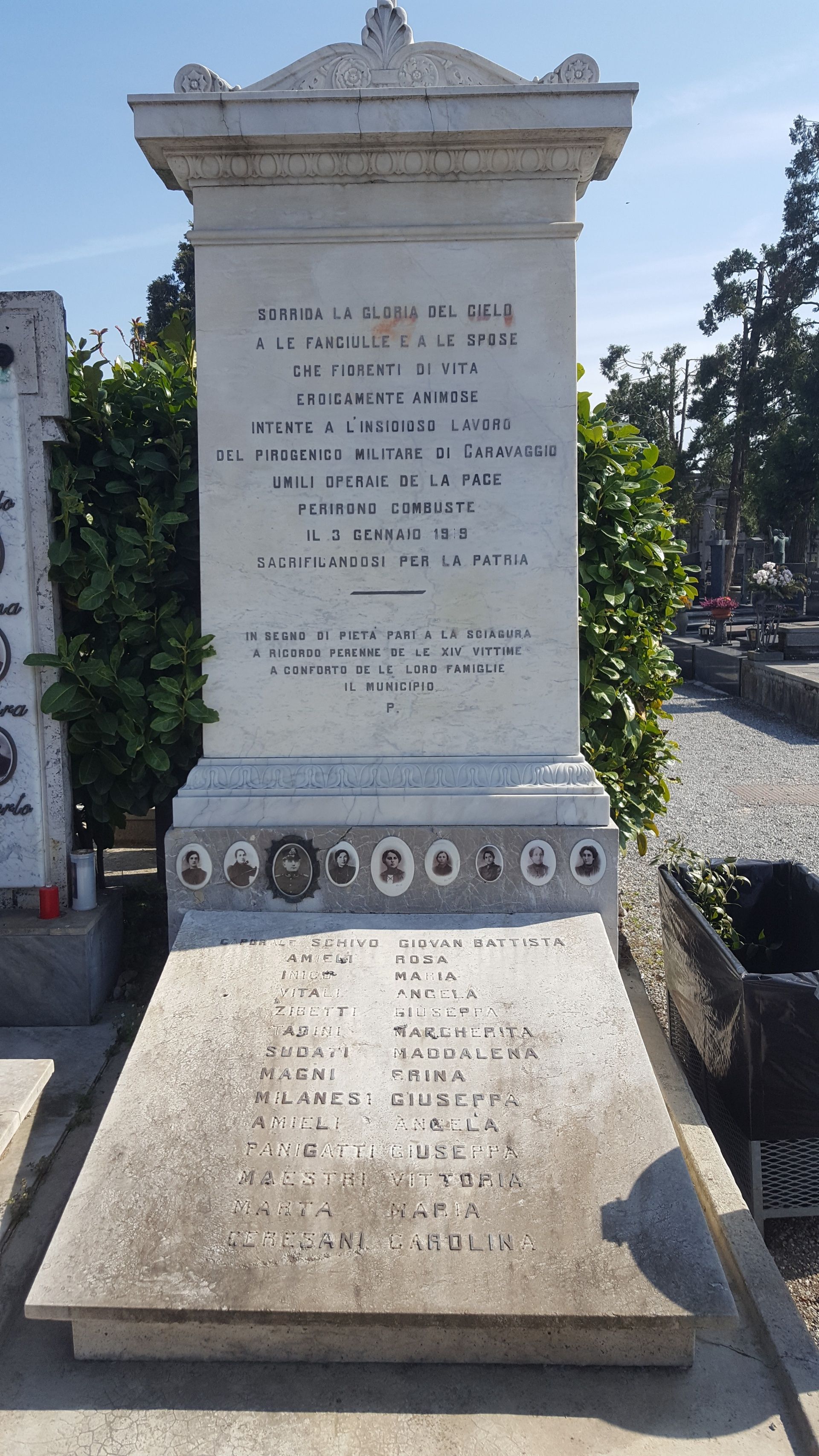 È stata una delle più gravi tragedie della storia di Caravaggio e il Comune non ha voluto dimenticarla insieme alle sue vittime: tredici donne, fra i venti e trent’anni, rimaste uccise il 3 gennaio 1919 perché investite dall’esplosione di alcune bombe mentre erano intente a lavorare nell’azienda «Forni Hoffmann» requisita, agli inizi della Grande guerra, dall’autorità militare per la fabbricazione di razzi luminosi. Dello stabilimento, che assunse durante il conflitto mondiale il nome di Pirogenico Militare, rimane solo uno dei pilastri del cancello di ingresso.