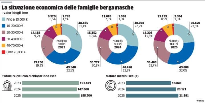 Lo dice il nome stesso: è la fotografia della situazione economica «equivalente», dove l’insieme di reddito e patrimonio viene combinato all’ampiezza e alle caratteristiche del nucleo familiare. Nei nuovi dati dell’Inps sugli Isee elaborati nel 2025 in Bergamasca scorre appunto un quadro composito, che suggerisce una doppia tendenza: la «ricchezza» cresce, passo dopo passo (il valore medio è salito del 7% nell’ultimo anno), ma ben più della metà dei nuclei (che possono rappresentare singole persone o, più spesso vista la natura di questa dichiarazione, famiglie) rimane sotto i 20mila euro.