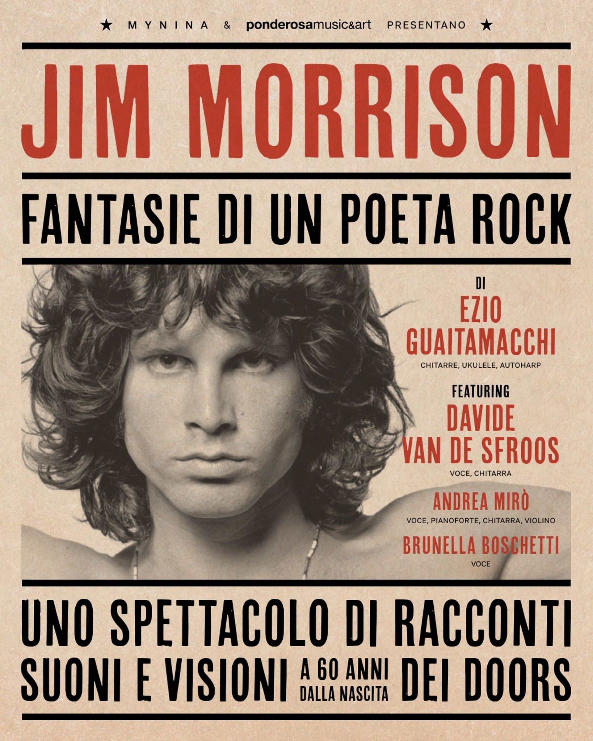 A sessant’anni dalla nascita della band, Guaitamacchi – giornalista, musicista e autore radiotelevisivo – porta in scena un racconto teatrale e musicale che intreccia parole, immagini e canzoni. Il pubblico viene guidato alla scoperta del volto più autentico e visionario di Jim Morrison: un artista enigmatico, carismatico, capace di trasformare poesia, ribellione e inquietudine in espressione creativa.