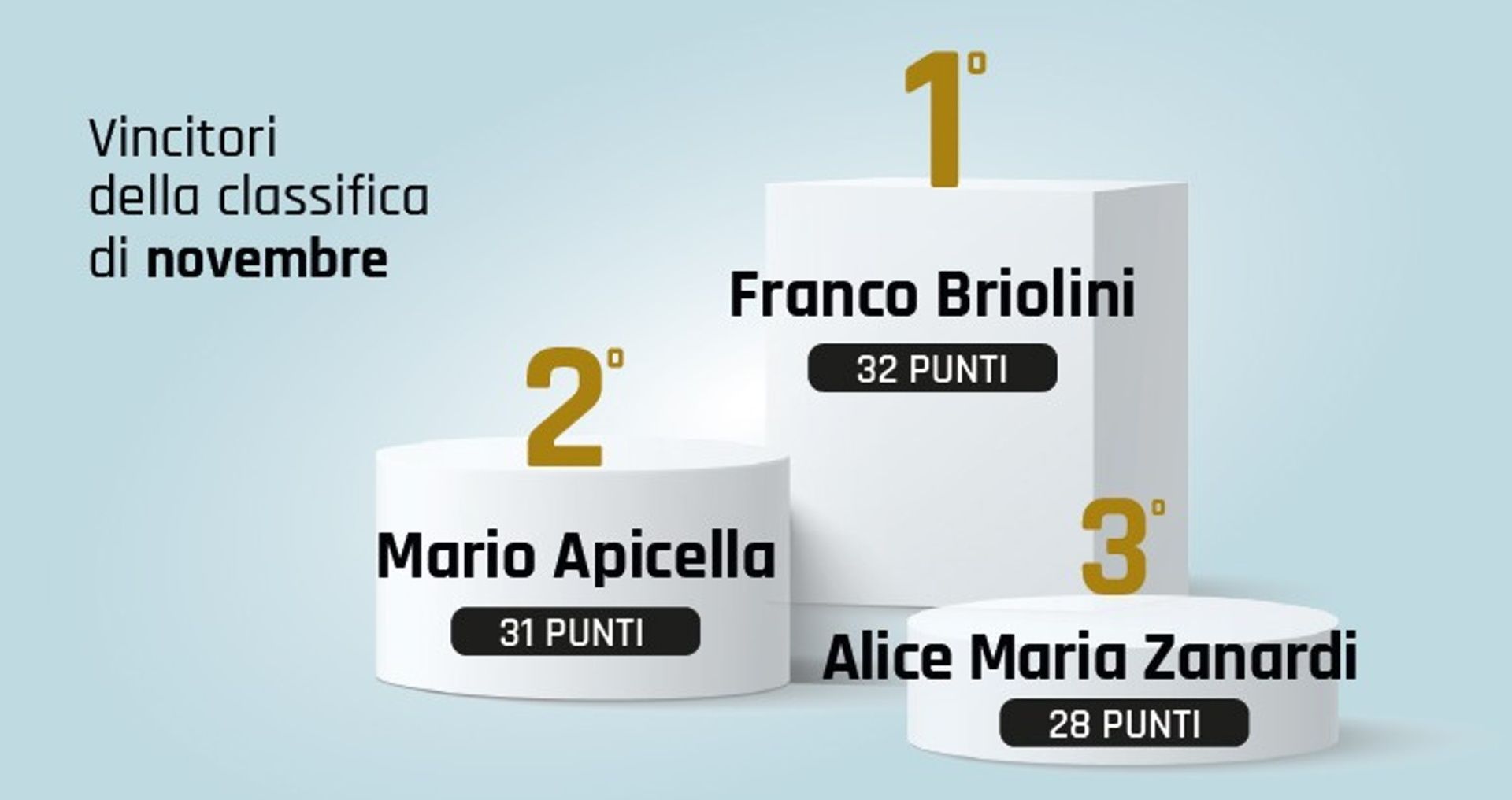 C’è bagarre nella classifica mensile. Giovanni Pietro Belotti - con 24 punti, di cui ben 14 ottenuti contro il Chelsea -, guida la graduatoria, tallonato da un duo a 23: Camilla Morosini ed Enrico Bonzi, entrambi autori di 13 punti con gli inglesi. Mario Stroppa è a 20, inseguito dal trio a 19 composto da Roberta Dendena, Alessandro Magri e Arrigo Casati. Seguono in sei a quota 18 e ben undici partecipanti con 17 punti.