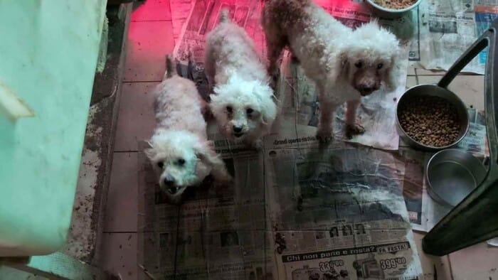 Molti animali presentano dermatiti, otiti, denti completamente marci, parassiti, mutilazioni e gravi infezioni cutanee Il pelo bianco era marrone di urina ed escrementi.