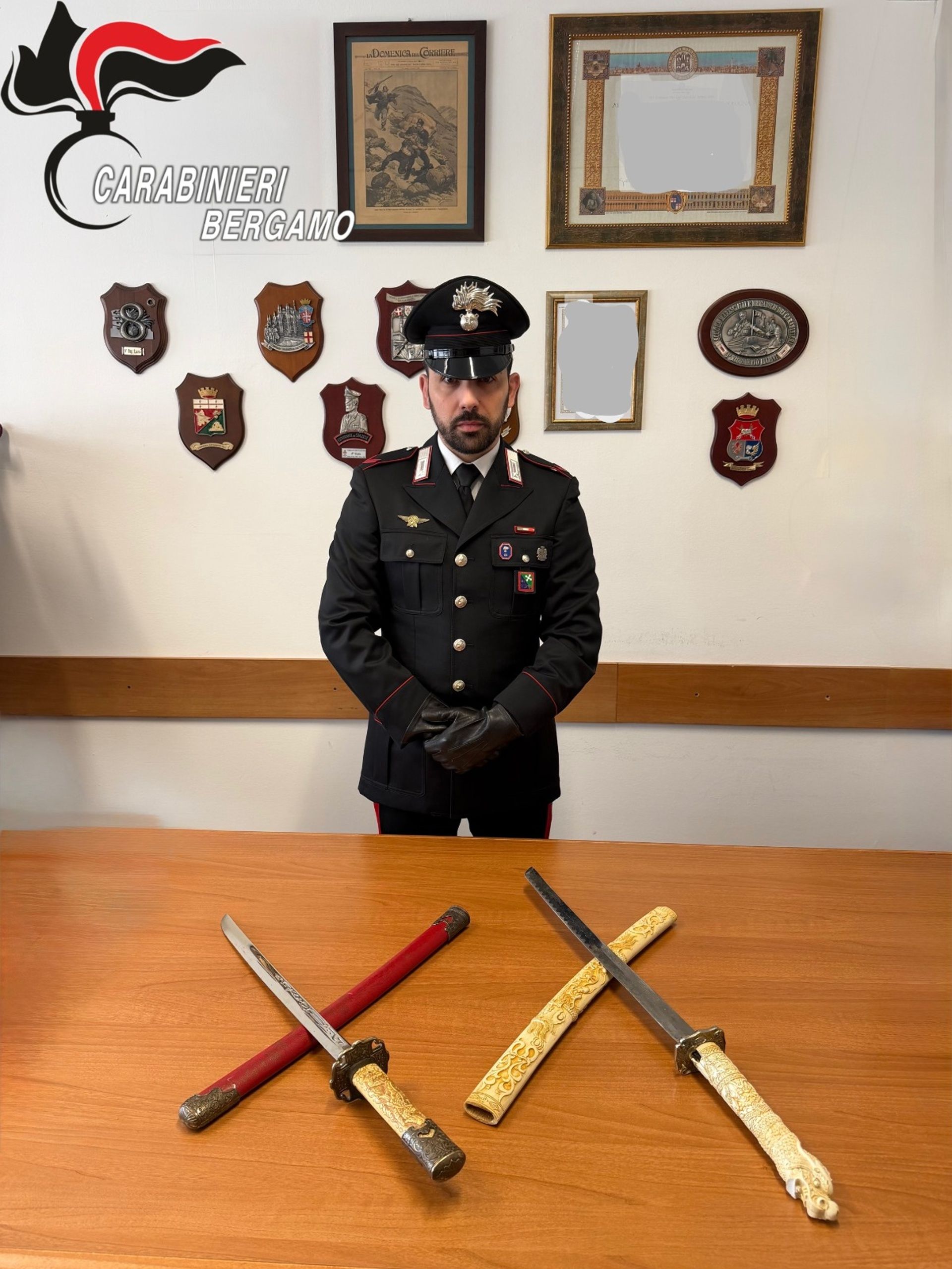 Durante la perquisizione domiciliare i carabinieri hanno rinvenuto e sequestrato due spade giapponesi (katane) con lama di circa 46 centimetri, detenute senza le necessarie autorizzazioni.