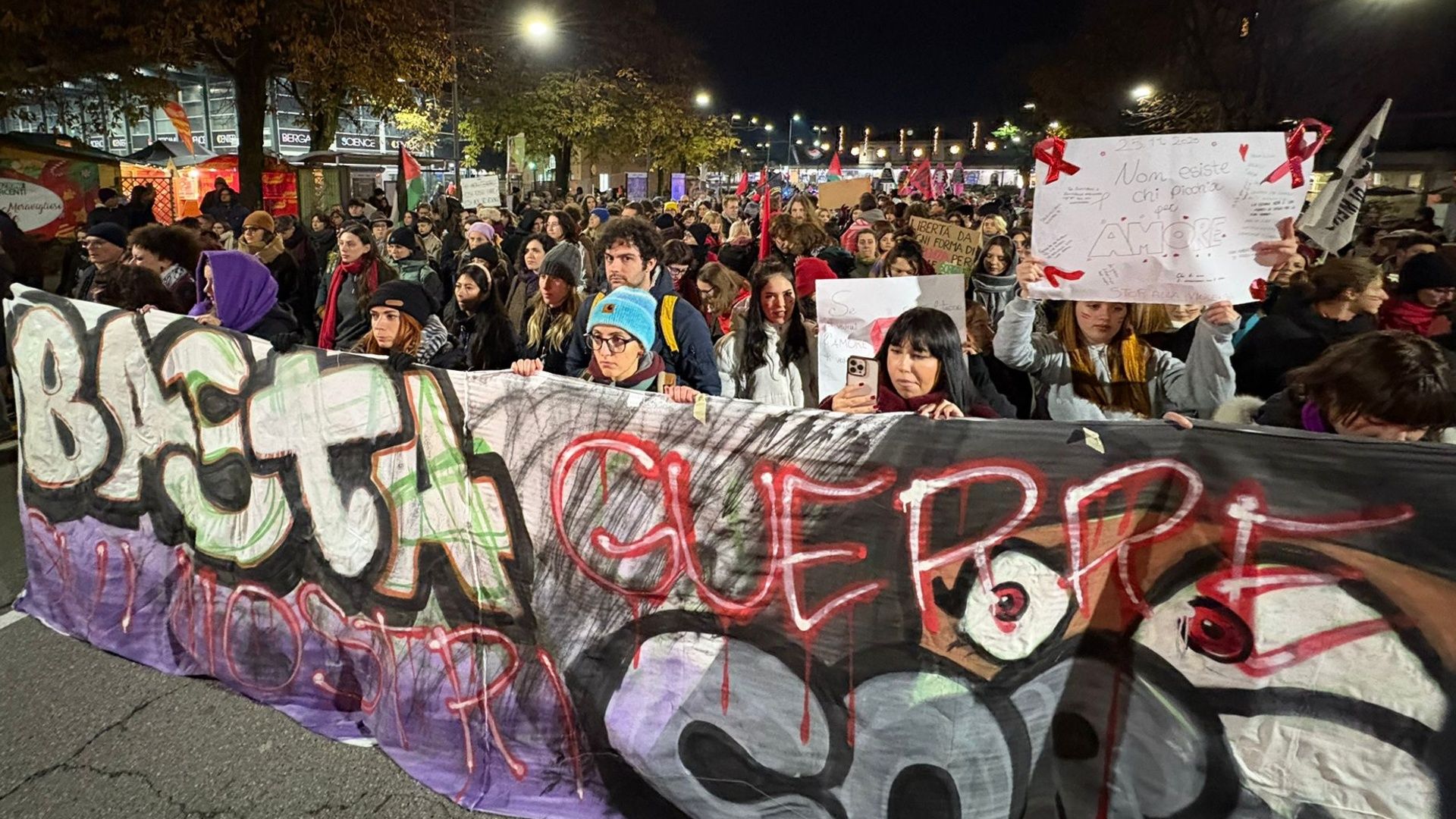 «Basta guerre sui nostri corpi», è lo striscione in testa al corteo per la Giornata internazionale per l’eliminazione della violenza contro le donne. Sono circa 500 i manifestanti scesi in piazza questa sera, martedì 25 novembre, per far sentire la propria voce e dire basta a discriminazioni, aggressioni e sopraffazioni di genere.