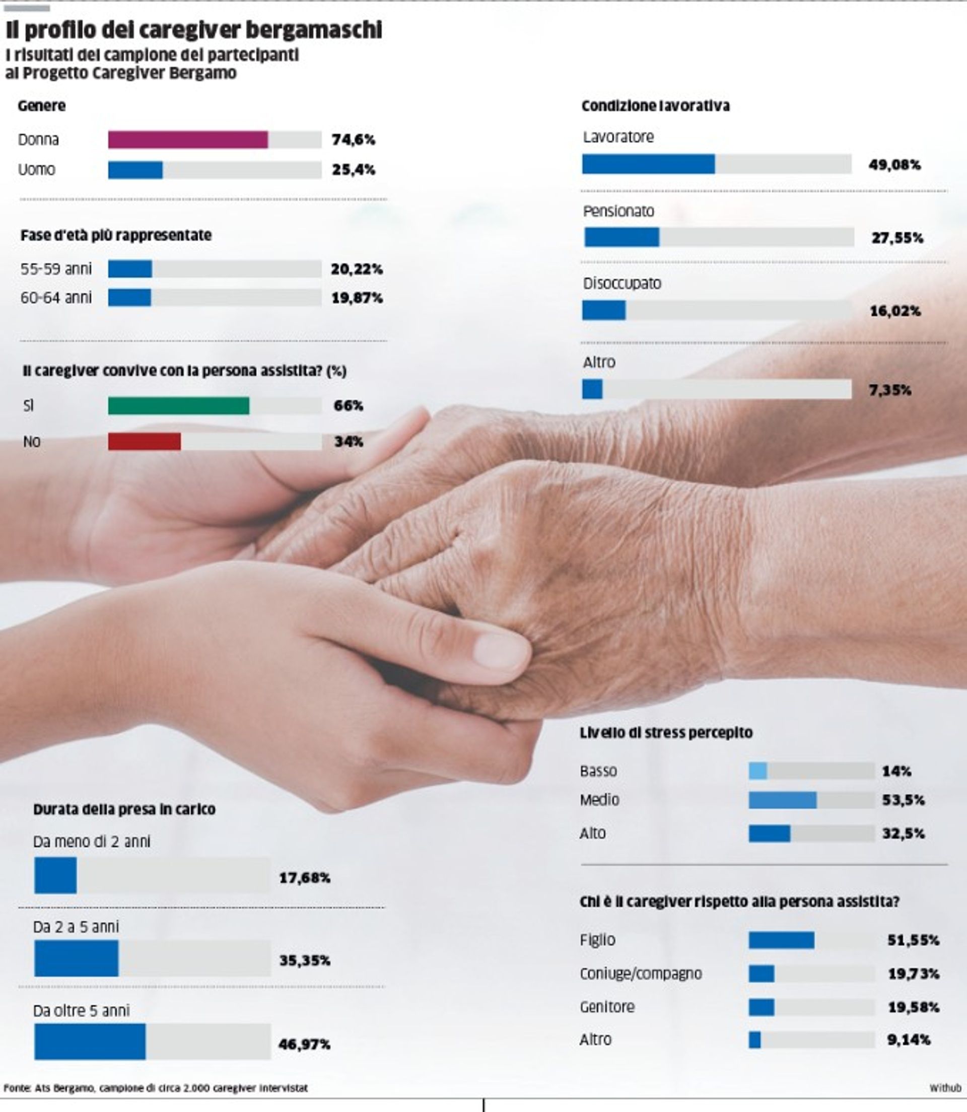 L’Ats ha anche sondato una platea di 2mila caregiver bergamaschi, tracciando un profilo utile a comprenderne le caratteristiche e calibrare gli interventi. Sono prevalentemente donne (74,6%), le fasce d’età più rappresentate vanno dai 55-59 anni (20,2%) ai 60-64 anni (19,9%). È un compito spesso gravoso: il 53,5% riporta uno stress «medio» e il 32,5% «alto», descrivendo – spiega l’Agenzia – «una condizione di pressione diffusa nel campione». Anche perché quasi la metà di loro (il 47%) assiste una persona fragile da più di 5 anni, e il 35,35% da 2-5 anni; tra l’altro, due caregiver su tre (66%) sono conviventi. Quanto alla compatibilità con la vita professionale, il 49,1% degli intervistati lavora, mentre la restante parte è in pensione (27,6%) o disoccupato (16,0%).