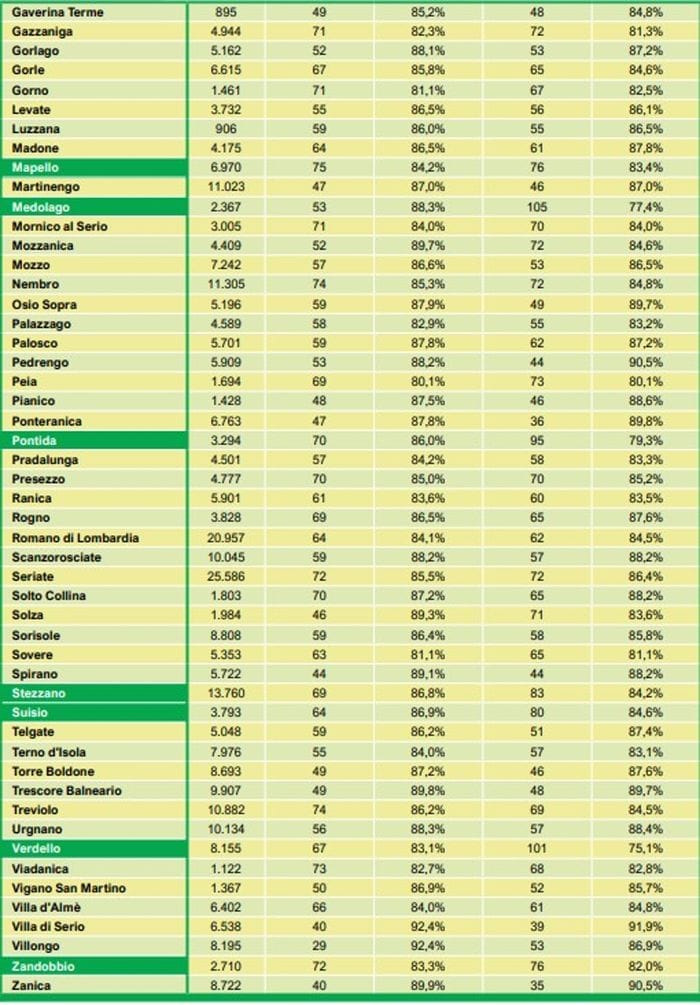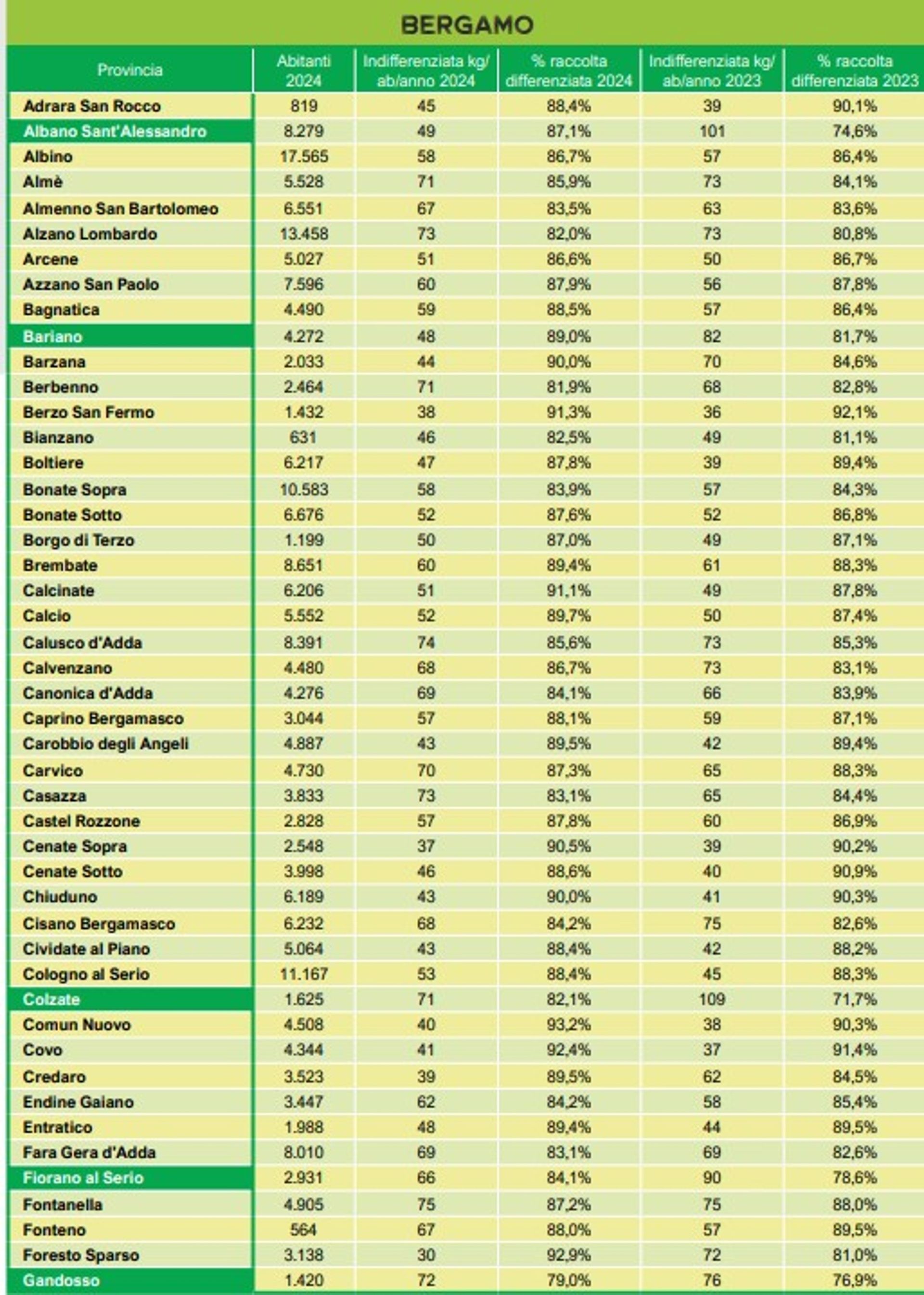 E Bergamo si conferma protagonista: con 98 Comuni Ricicloni è la provincia lombarda con il maggior numero di amministrazioni virtuose, pari al 50,1% degli abitanti sotto la soglia dei 75 chili annui di rifiuto secco indifferenziato pro capite, il parametro fissato da Legambiente per entrare nella classifica. Seguono Varese, Mantova e Milano.