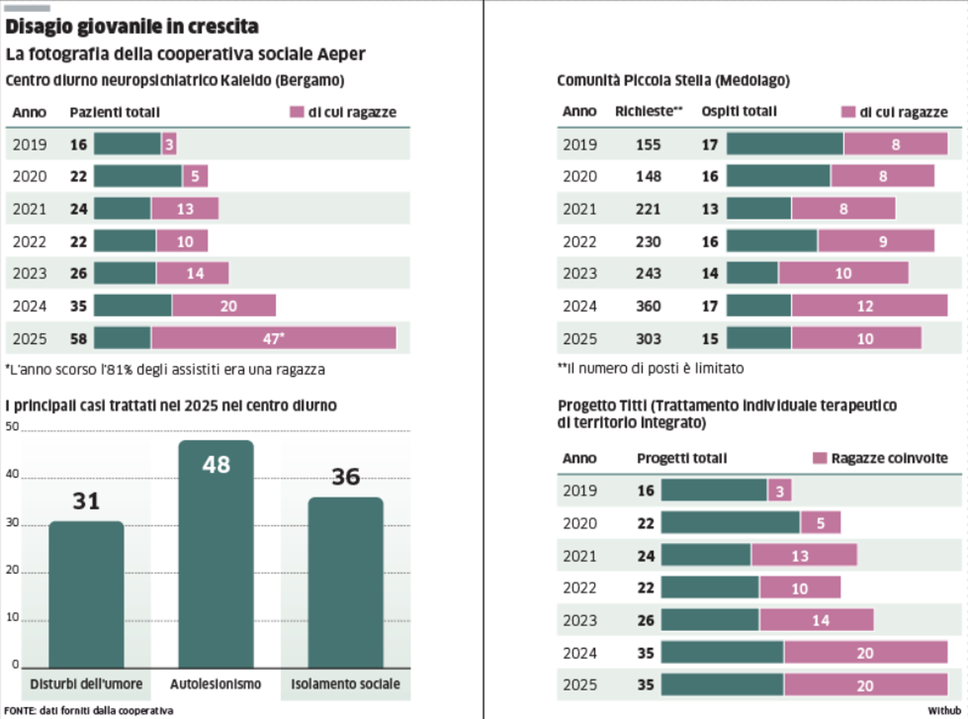 I numeri del disagio giovanile sono in aumento da qualsiasi parte si posizioni la lente d’ingrandimento, con dati che – in alcuni casi – risultano addirittura più che triplicati rispetto al 2019. E con un netto aumento delle ragazze, soprattutto negli ultimi anni. Il punto di osservazione è quello della cooperativa sociale Aeper, che ha raccolto gli accessi, le prese in carico e le richieste registrate tra il 2019 e il 2025 dai suoi servizi di neuropsichiatria infantile: il centro diurno terapeutico Kaleido di Bergamo (in città è attivo anche il Centro Geode, servizio specialistico di psicologia clinica e neuropsichiatria), la comunità Piccola Stella di Medolago e il Trattamento individuale terapeutico di territorio integrato (che si configura come progetto di domiciliarità).