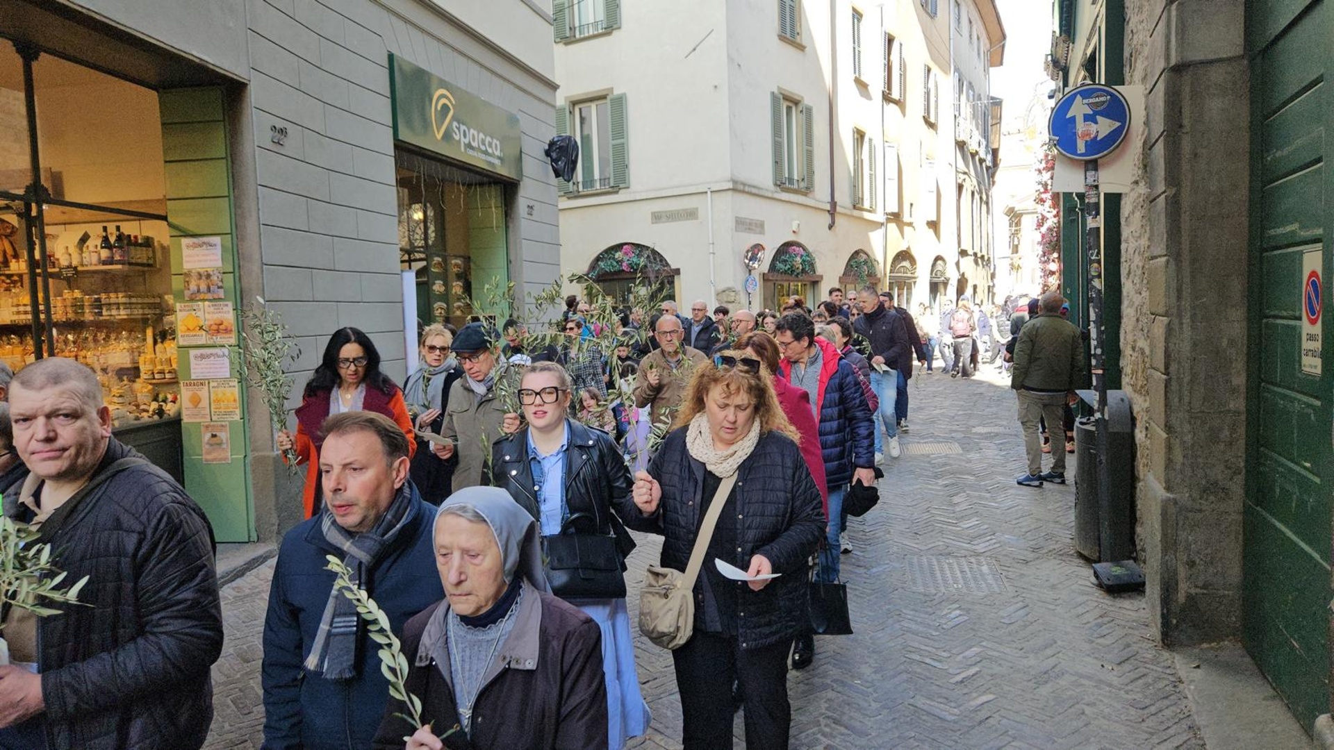 VERSO LA PASQUA. Cattedrale gremita in Città Alta per la Domenica delle Palme. La tradizionale processione con i rami d’ulivo insieme a monsignor Francesco Beschi.