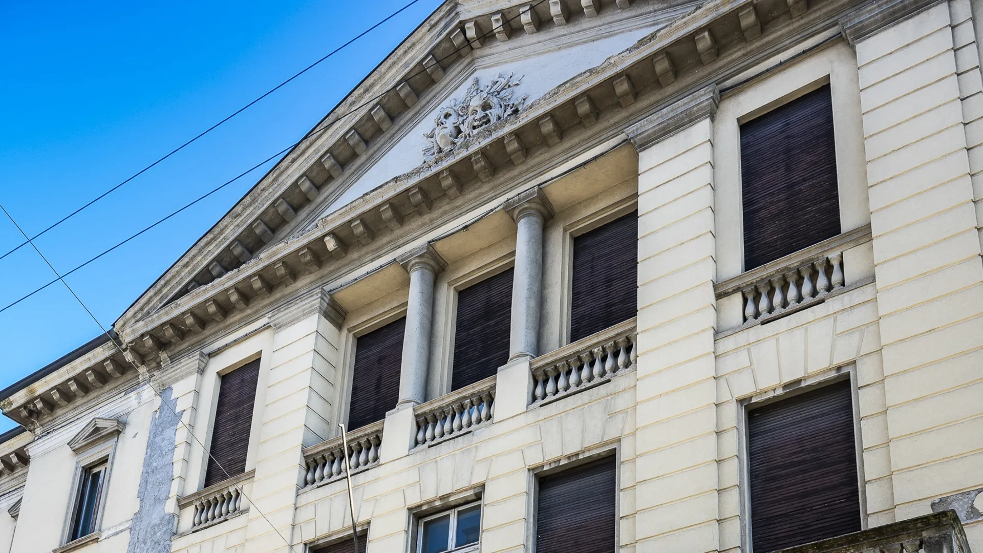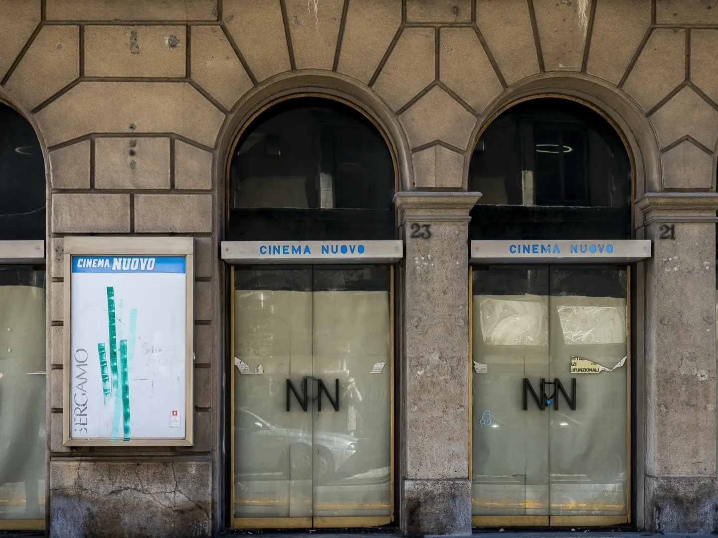 L’intonaco scrostato della facciata sembra scoprire lo scheletro sempre più fragile di un edificio che per cent’anni ha contribuito a fare la storia culturale della città. Nelle vetrine che un tempo ospitavano le locandine di film e spettacoli si intravede ancora, sbiadito ma riconoscibile, il vecchio logo di BergamoScienza, che qui ha tenuto i suoi incontri nelle prime edizioni. Poco più in là, anche le lettere della targa di largo Belotti sono ormai quasi illeggibili. Frammenti di un passato che si sta dissolvendo, testimonianze di una memoria che il tempo sta offuscando.