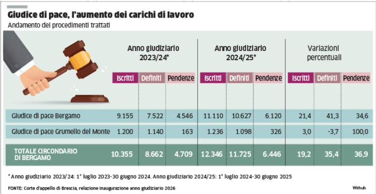 A Bergamo i mesi scorsi hanno portato un rafforzamento della pianta organica, facendo salire a 13 il numero dei giudici di pace in servizio, contro i 21 previsti; durante il 2026 dovrebbero entrarne in servizio altri cinque all’incirca, ma anche con questi innesti non si giungerà alla completa saturazione. Intanto, la mole di lavoro continua a farsi più pesante.