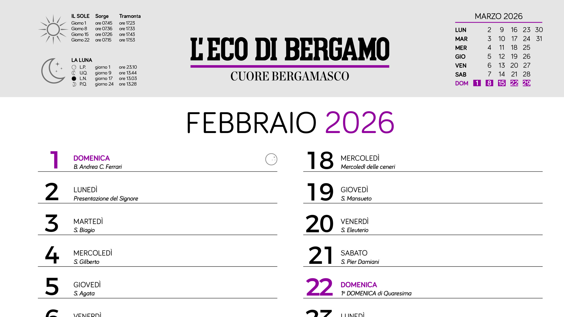 Da appendere in ufficio o in casa, per non dimenticare appuntamenti, eventi, per organizzare al meglio il lavoro e le attività di tutti i giorni: si tratta dello storico calendario a muro de L’Eco di Bergamo e lo troverete in omaggio acquistando la copia del giornale di giovedì 4 dicembre. È una tradizione che si rinnova annualmente, un dono dal giornale ai lettori. Come ogni giorno L’Eco di Bergamo fa parte delle vostre vite, entrando nelle vostre case - fornendo un’informazione completa di quel che succede a Bergamo e Provincia e così va avanti da ben 145 anni, quasi un secolo e mezzo - così il calendario vuole essere un supporto quotidiano alle vostre attività, un dono semplice, ma efficace, che vi farà sentire sempre la nostra vicinanza.