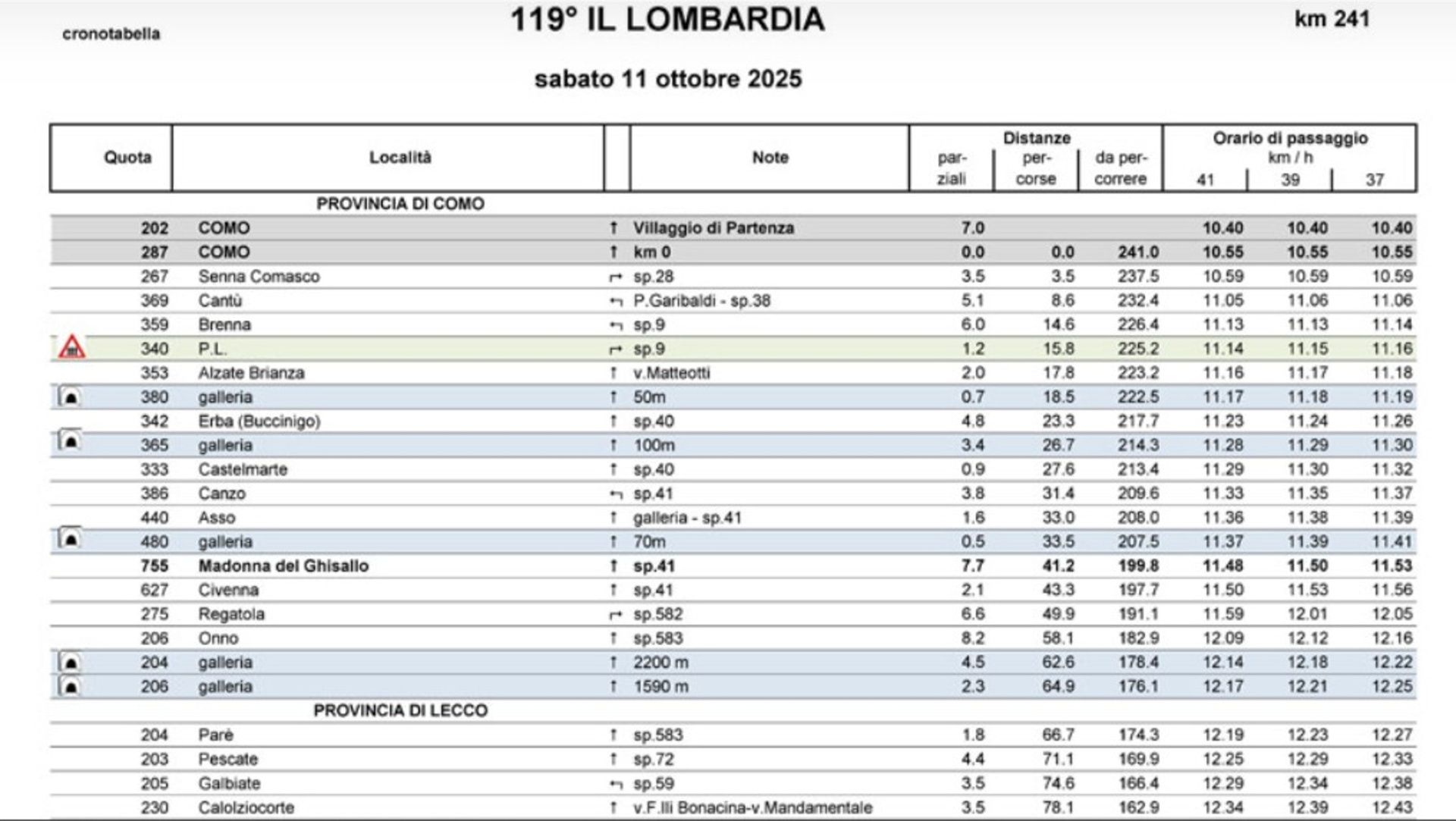 La corsa, lunga 241 chilometri con 4.400 metri di dislivello, è partita da Como alle 11 e si conclude nel cuore di Bergamo, dopo aver attraversato le valli e le salite simbolo del territorio. Il passaggio in territorio bergamasco è previsto intorno alle 12.50 a Caprino per poi attraversare la Valle Imagna, la Valle Brembana e prima di giungere a Bergamo anche la Valle Seriana. L’ingresso in città dovrebbe avvenire, a seconda dell’andatura dei corridori, tra le 15.30 e le 18 ma già in mattinata ci sono code e traffico in viale Papa Giovanni XXIII e in centro città.
