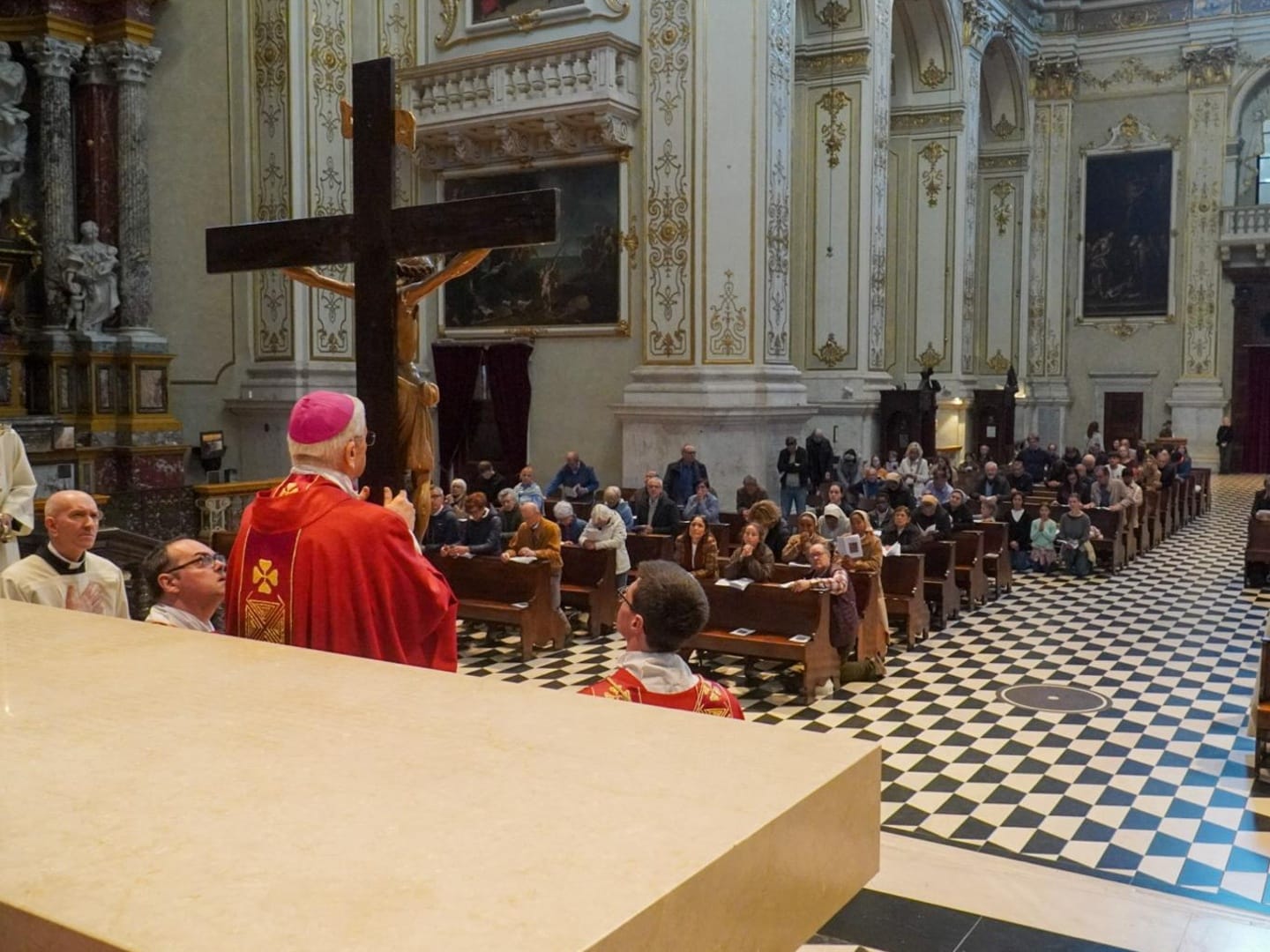 Si sono così rinnovati ancora una volta, nel tardo pomeriggio del 3 aprile in Cattedrale, nel giorno di Venerdì Santo, i misteri della Celebrazione della Passione del Signore, resa ancor più solenne dai solisti della Cappella del Duomo, accompagnati dall’organo del Maestro Sergio Rovetta, e suddivisa nelle sue tre fasi fondamentali: la Liturgia della Parola, al cui cuore c’è il Vangelo di Giovanni, che è stato letto a tre voci da altrettanti diaconi distribuiti tra i due amboni e il leggio; l’adorazione della Croce, che è stata portata all’altare dal Vescovo a partire dalla Cappella della Santissima Eucaristia; e con la Santa Comunione, compiuta con le specie eucaristiche consacrate giovedì nella Messa in Coena Domini e portate anch’esse all’altare, nelle loro due pissidi, da un diacono avvolto nel velo omerale. Dal drammatico racconto dell’apostolo Giovanni, e ancor più dalla sua conclusione, dalle parole di Gesù «Ho sete», cui segue la somministrazione dell’aceto e quella frase, «È compiuto», dopo la quale, chinato il capo, «consegnò lo spirito», ha preso spunto il Vescovo per la sua breve omelia.