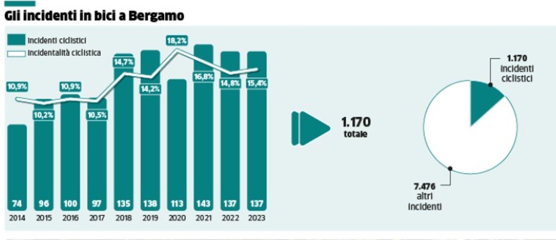 In dieci anni le strade della Bergamasca hanno registrato 3.776 incidenti in bicicletta, a fronte di 23.340 sinistri complessivi. Bergamo è il comune con il maggior numero di incidenti in bici, appunto 1.170 nei dieci anni in esame. Seguono le località più grandi della provincia: Treviglio con 306, Dalmine con 115, Seriate con 98, Caravaggio con 76, Romano di Lombardia con 59, Albino con 56, Osio Sotto con 53, Curno con 46, Nembro con 45 e Albano con 42, per citare i primi dieci Comuni. A livello nazionale, invece, il numero di incidenti in bicicletta è in calo: erano stati 17.446 nel 2014 e sono scesi a 16.488 nel 2023. È tuttavia rimasta uguale la percentuale rispetto al totale dei sinistri, pari al 9,9% sia nel 2014 che nel 2023. Tra le località spicca Milano, con ben 10.372 incidenti in bici in dieci anni. Ben distante il dato della seconda località, Roma, con 3.457 sinistri, seguita da Padova con 3.132. Bergamo è al 19° posto.