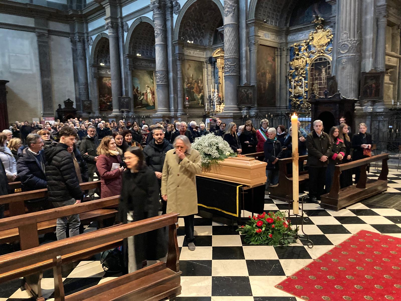 I FUNERALI. Tanti i rappresentanti del Comune di Bergamo e dell’associazionismo presenti in Santo Spirito per l’addio all’insegnante e promotrice del Circolo dei narratori.