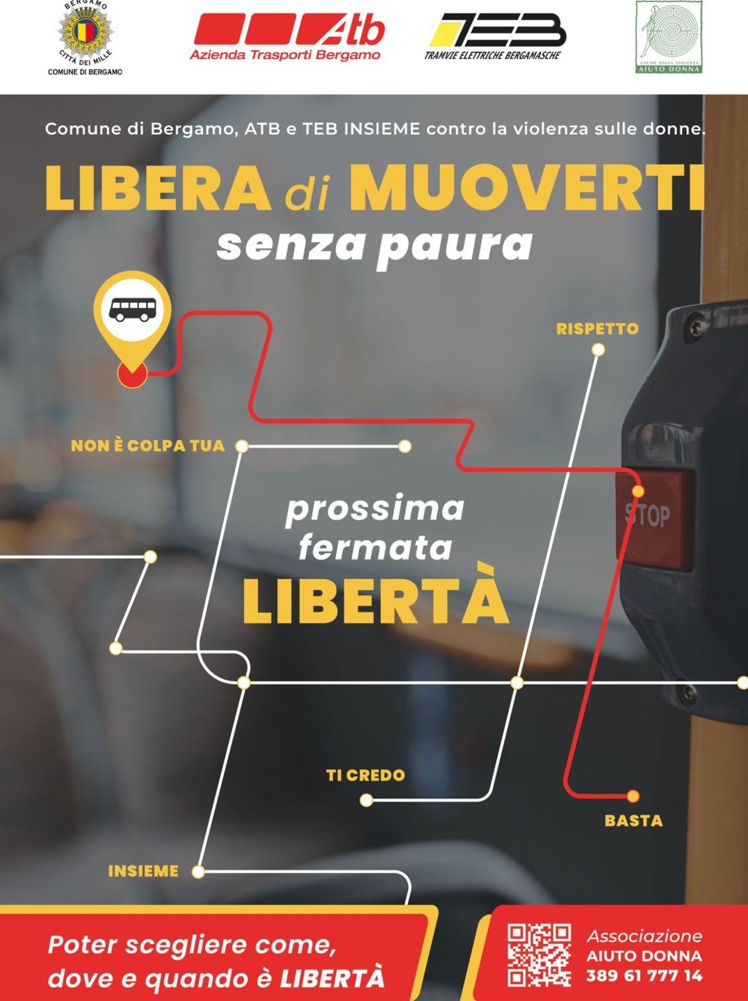 Un viaggio simbolico tra le strade della città, per affermare il diritto di ogni donna a muoversi libera e senza paura. Prende il via giovedì 14 novembre la campagna di sensibilizzazione contro la violenza sulle donne «Libera di muoverti, senza paura», promossa dal Comune di Bergamo in collaborazione con Atb e Teb, e con il supporto dell’associazione Aiuto Donna.