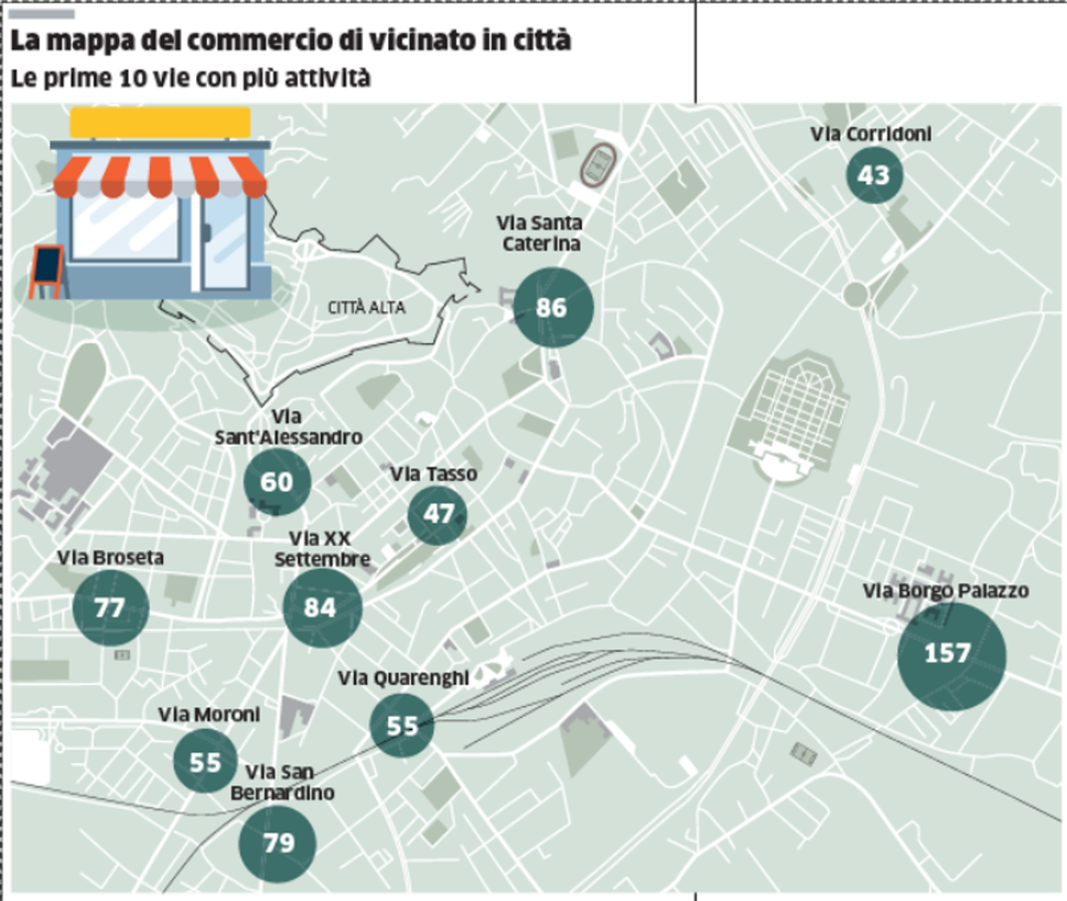 La graduatoria prosegue nei dintorni: via San Bernardino sbocca da quelle parti, ma prosegue fin verso la periferia sommando 79 attività di vicinato, analogamente a via Broseta dove ne sono registrate 77; se ne trovano poi 60 in via Sant’Alessandro, 55 in via Quarenghi (a forte trazione straniera) e 55 anche nella lunga via Moroni, 47 in via Tasso, mentre appena fuori dal centro ha una buona presenza via Corridoni (43). Oltre la top-ten ci sono alcuni flash: in Città Alta ovviamente il cuore è Corsarola, con 37 botteghe in via Colleoni e poi altre 16 in via Gombito; in città bassa, viale Papa Giovanni si ferma a 23, ma perché lì ormai prevale il food.