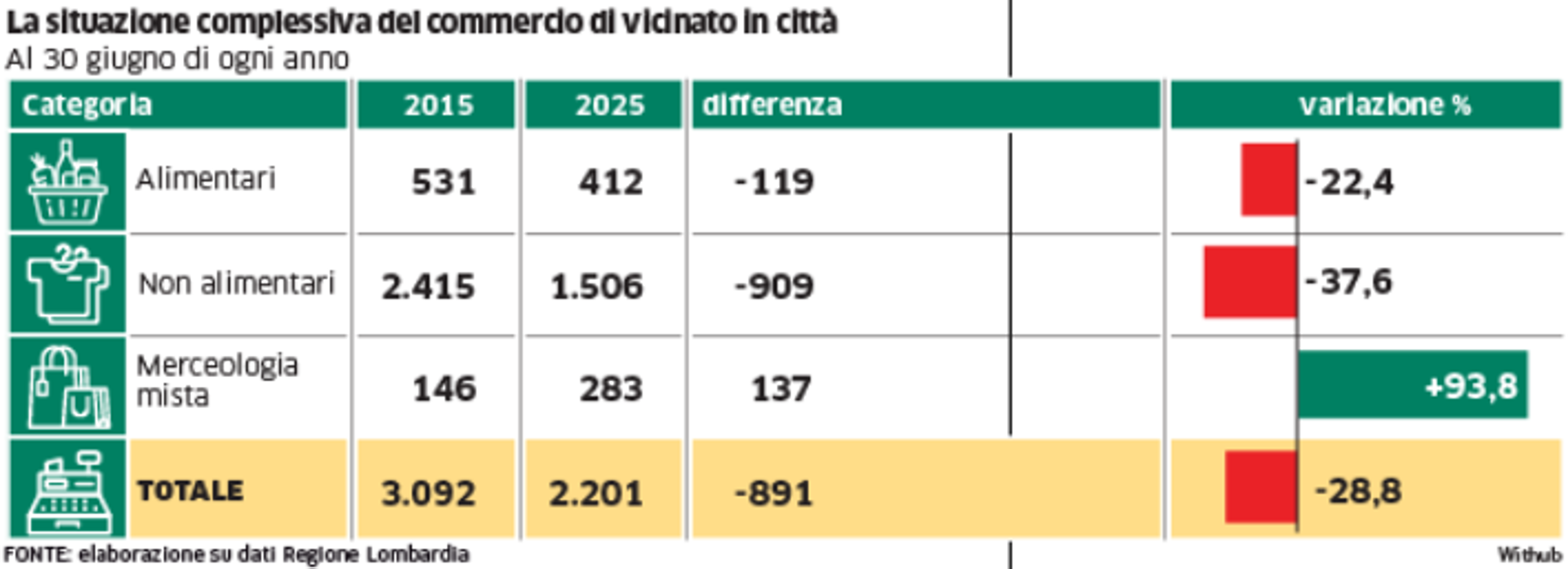 Certo, nell’ultimo decennio la desertificazione è stata evidente: lo stesso censimento della Regione aggiornato al 30 giugno 2015 indicava un totale di 3.092 «insegne», tra alimentari (531), non alimentari (2.415) e a merceologia mista (146), e dunque nel giro di un decennio ne sono scomparse 891 (-28%, più di una su quattro).