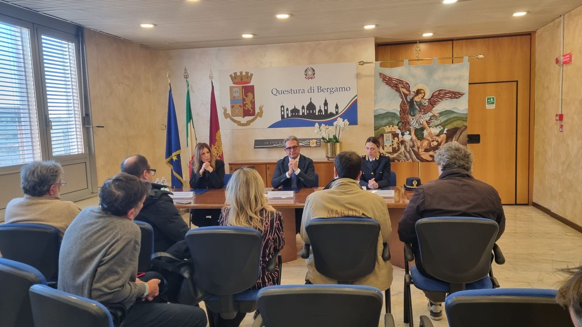 Il suo primo gesto a Bergamo la deposizione di una corona al monumento dei Caduti presso la nostra Questura, alla presenza del Cappellano della Polizia di Stato e dell’Associazione Nazionale della Polizia di Stato. Nel corso della mattina, il Questore ha poi incontrato i Dirigenti e funzionari della Questura e delle specialità, i rappresentati delle organizzazioni sindacali e tutto il personale. Nel pomeriggio il Questore incontrerà il Vescovo di Bergamo, il Sindaco e i Vertici delle altre forze di polizia. Nei prossimi giorni proseguirà gli incontri istituzionali con il Prefetto, il Presidente del Tribunale, il Procuratore della Repubblica, il Presidente della provincia e altre Autorità civili.