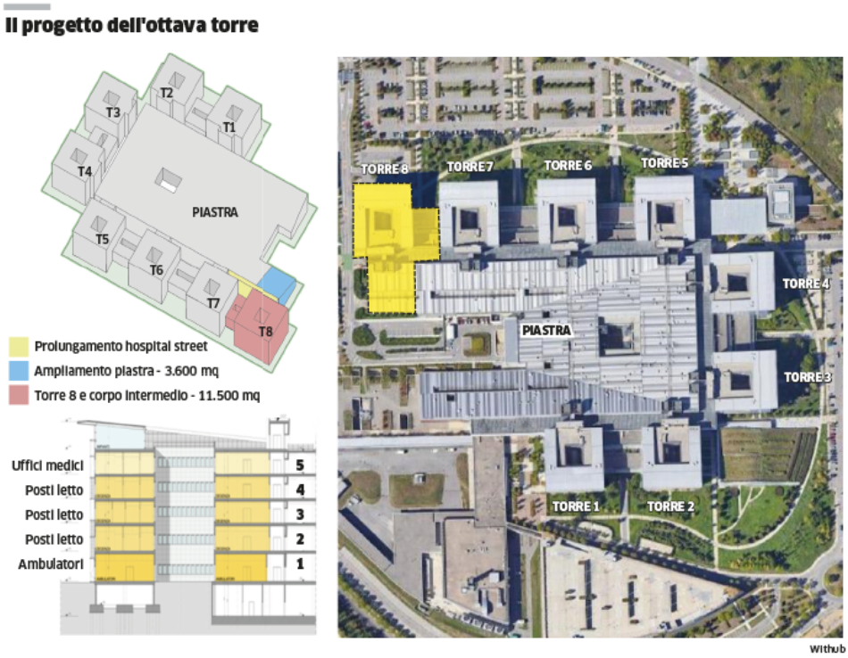 L’ottava torre sorgerà nell’area ovest dell’attuale sedime, in prossimità del «Giardino dell’incontro». In essa si concentrerà tutta l’attività oncoematologica, con i reparti di degenza ordinaria, diurna e ambulatoriale; saranno presenti anche posti letto riservati alla ricerca clinica e letti riservati ai pazienti oncologici provenienti dal pronto soccorso. Il risultato combinato sarà quello di spazi più innovativi, di percorsi più funzionali e di una presa in carico più sicura e immediata.