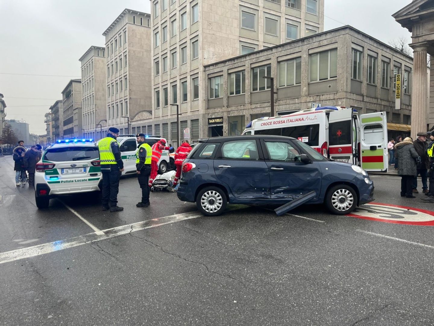 A loro anche il compito di effettuare i rilievi e risalire alla dinamica di quanto accaduto. Da una prima ricostruzione l’uomo è stato investito a seguito di una carambola tra due auto. Una Kia Sportage che proveniva da via Roma ed era diretta verso la stazione si è scontrata con una Fiat 500 che proveniva da via Camozzi verso il Coin . È proprio la 500 che ha fatto due testacoda e ha colpito con la parte posteriore l’uomo che stava attraversando nei pressi dell’incrocio.