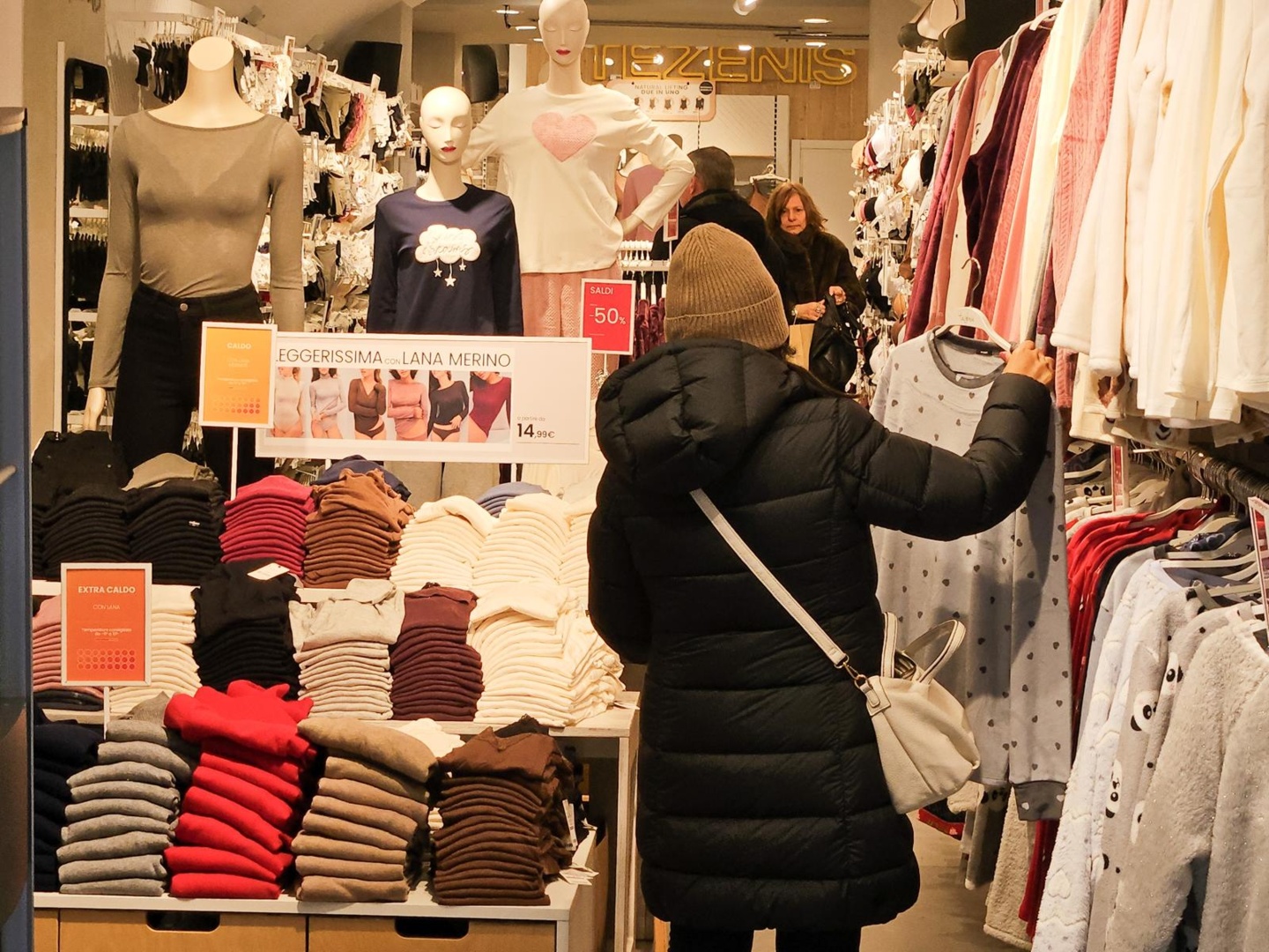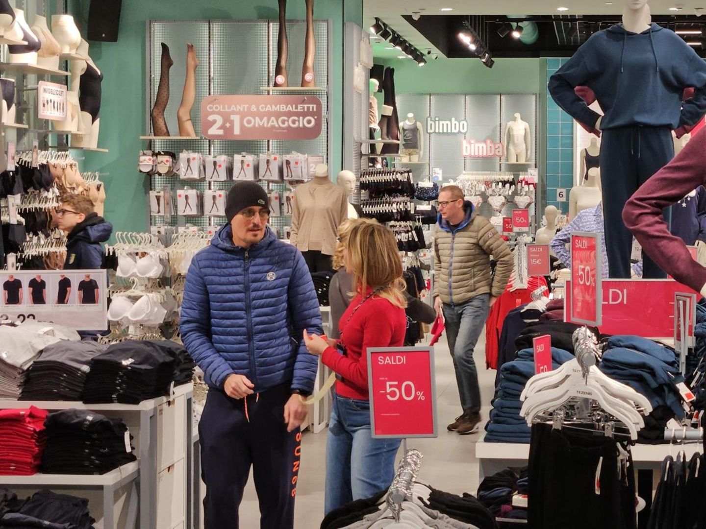 Tante le famiglie a passeggio con sacchetti alla mano. Le maggiori presenze sono concentrate nei negozi di abbigliamento e intimo.