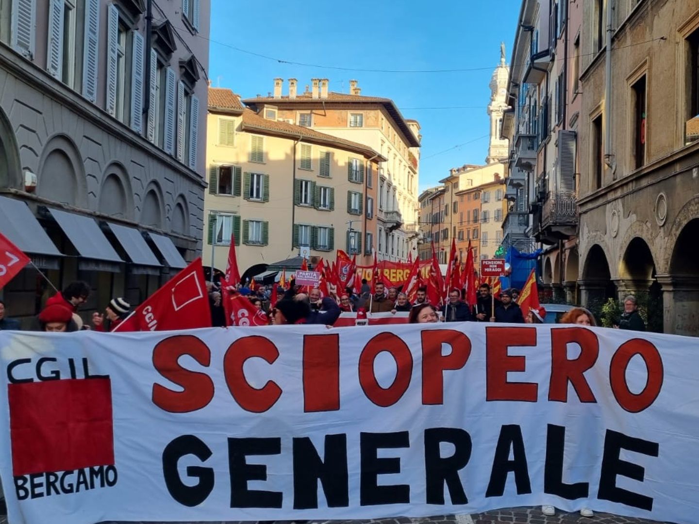 Buona affluenza al corteo organizzato a Bergamo in occasione dello sciopero generale indetto dalla Cgil. La manifestazione è partita alle 9,30 da piazza Pontida ed è diretta in Prefettura, per protestare contro la manovra finanziaria del Governo. «Diritti, non regali» è lo slogan scelto per la protesta, per chiedere, sotto Natale, interventi concreti per sostenere il lavoro, il welfare e le famiglie.