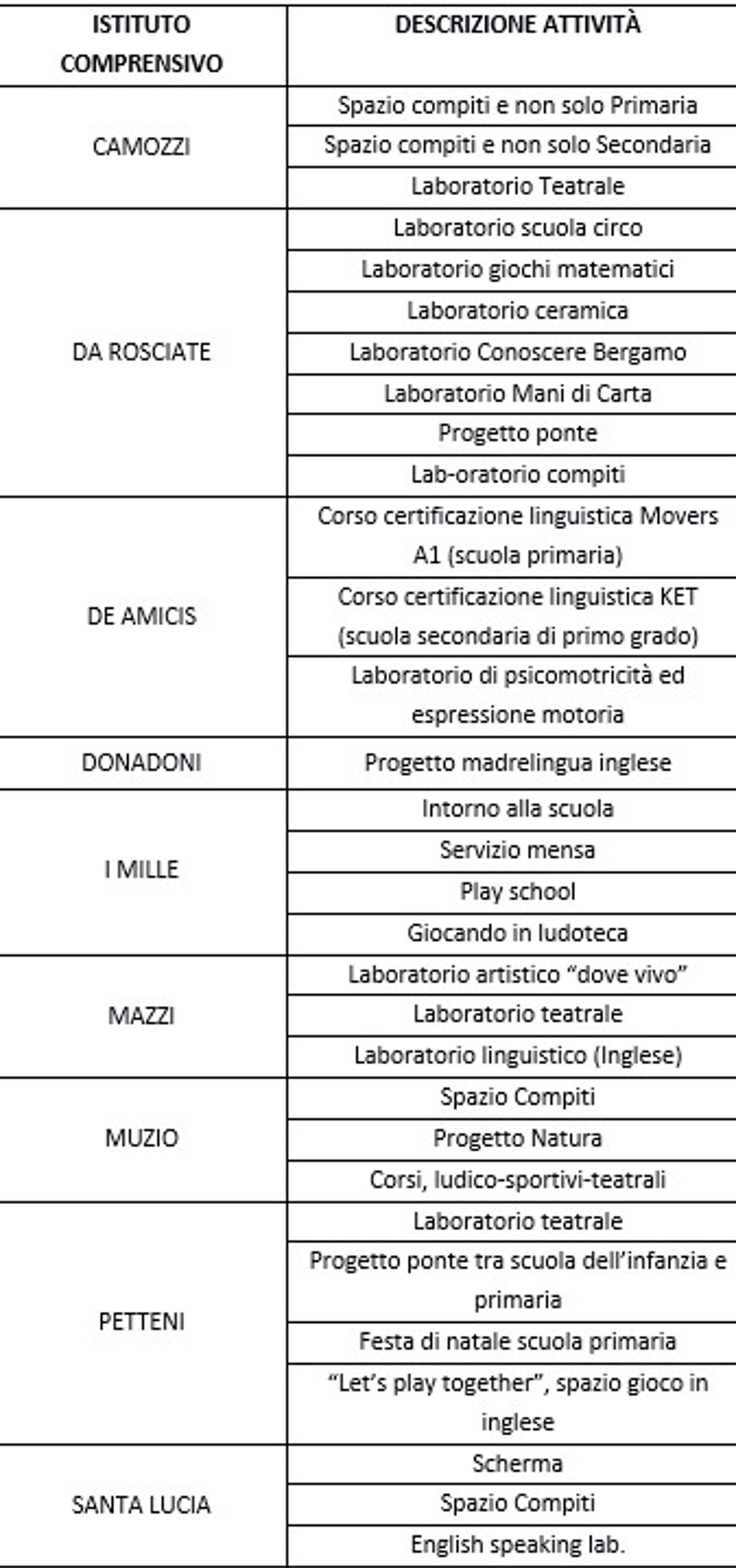 Le iniziative finanziate abbracciano diversi ambiti: laboratori espressivi, attività creative, supporto allo studio, servizi di conciliazione come pre-scuola, post-scuola e intermensa, percorsi di prevenzione e progetti di educazione alla cittadinanza. Le attività sono condotte da insegnanti, educatori, professionisti, volontari e, in alcuni casi, anche da studenti delle scuole superiori.