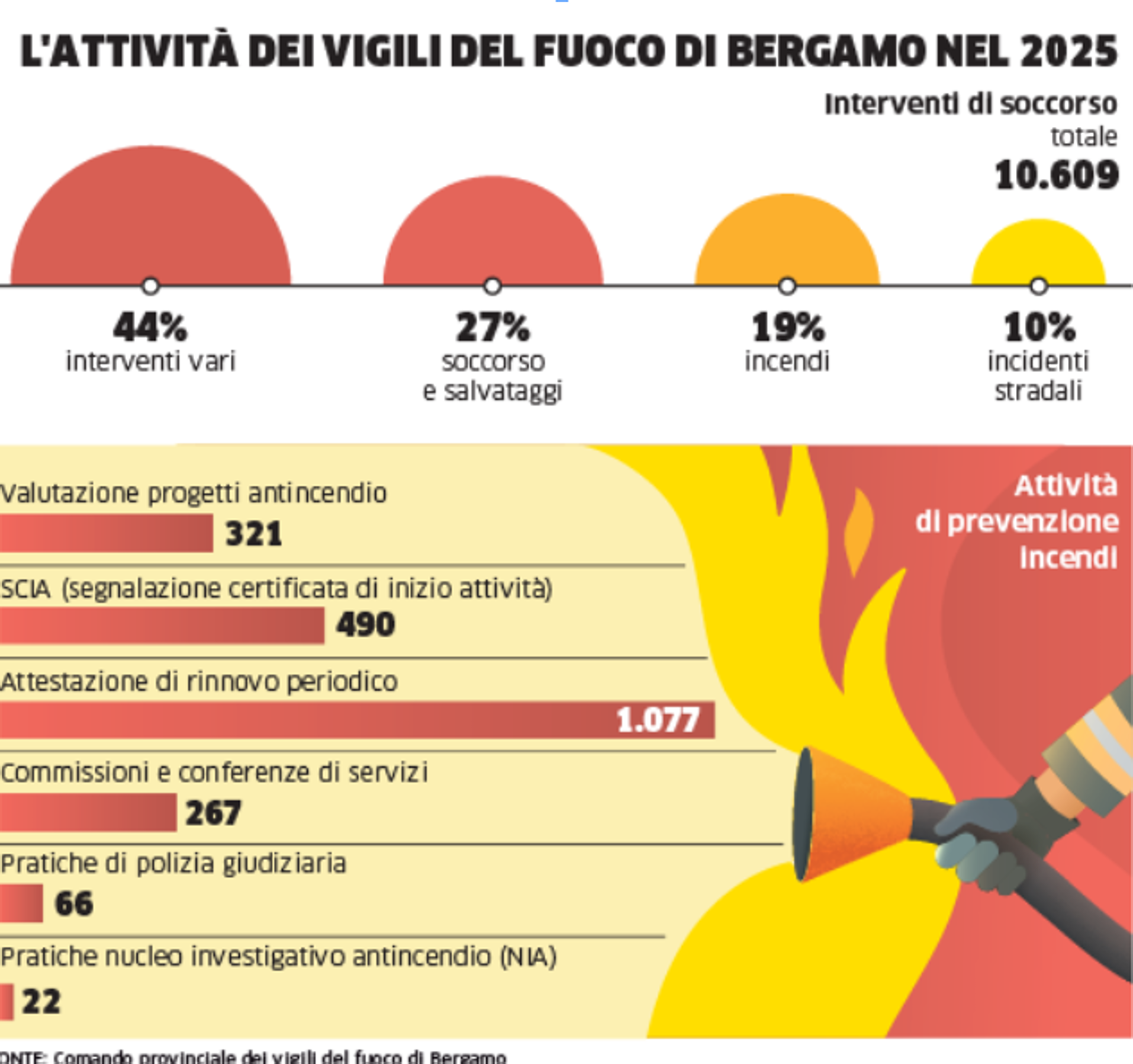 Oltre 10.600 interventi di soccorso nel corso del 2025 – precisamente 10.609 –, con una media di 29 ogni giorno. È il bilancio dell’attività del comando provinciale dei vigili del fuoco, che oggi festeggiano l’87° anniversario di fondazione del Corpo: si tratta del primo anno in cui viene celebrata questa festa distinta dalla storica cerimonia di Santa Barbara, Patrona dei vigili del fuoco, celebrata il 4 dicembre scorso (da quest’anno resteranno entrambe le cerimonie). Venerdì, alle 10.30, sarà il Centro di formazione regionale «Giuseppe Del Brocco» di Dalmine, ovvero il luogo dove si formano – nella teoria e nella pratica – le nuove generazioni di pompieri, a ospitare la cerimonia istituzionale, intitolata «Lì dove serve»: saranno premiati i vigili del fuoco che si sono distinti per attività e anzianità di servizio.