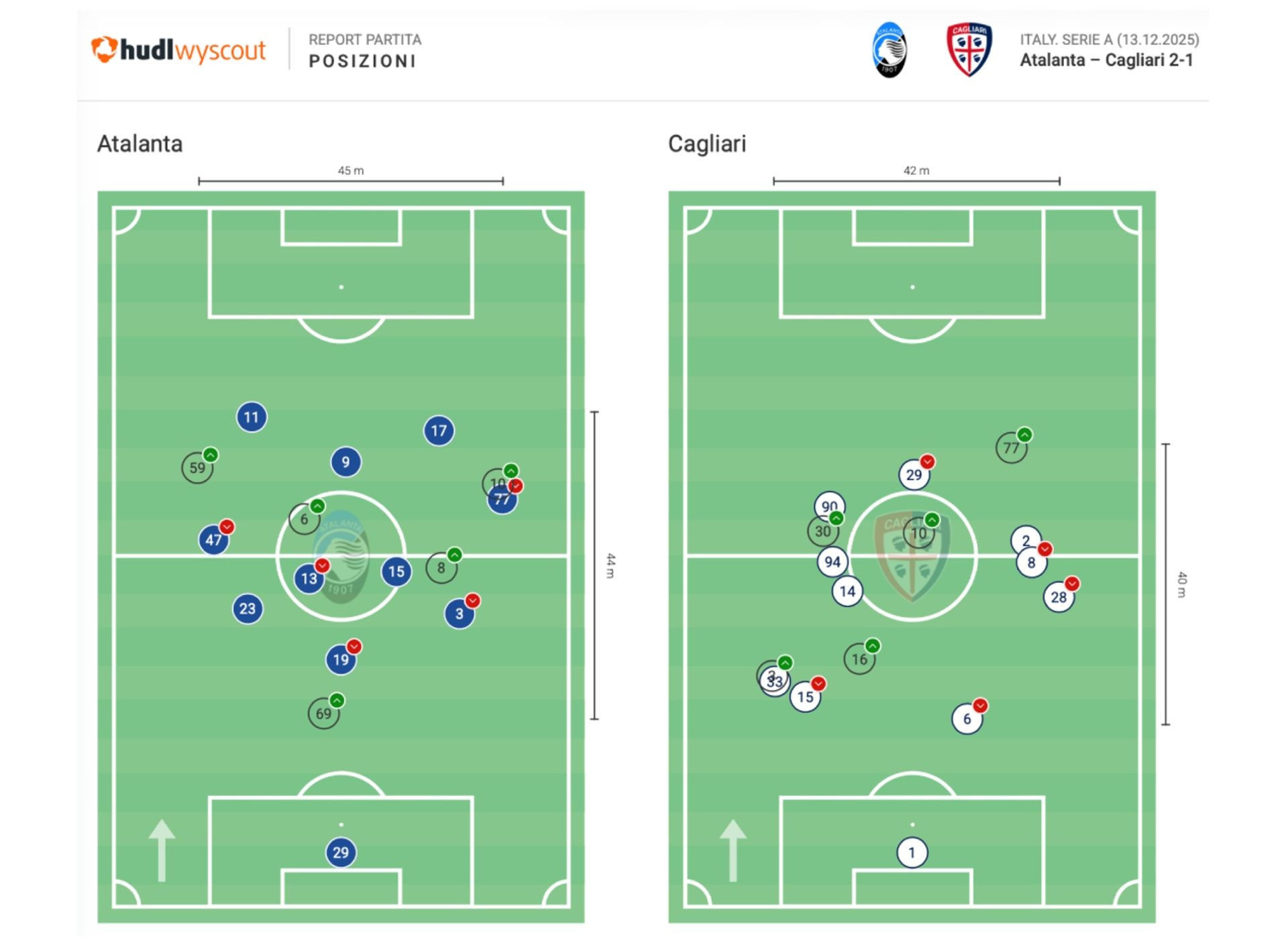 La partita ha preso una direzione chiara già nel primo tempo, quando l’Atalanta ha imposto controllo territoriale, ritmo e qualità nella circolazione del pallone. La squadra ha occupato stabilmente la metà campo avversaria, ha mosso il possesso con buona velocità nonostante gli spazi stretti e ha creato un volume di occasioni nettamente superiore rispetto al Cagliari. I dati hanno confermato questa sensazione, con un valore di Expected Goals già molto alto all’intervallo e diverse conclusioni arrivate da zone favorevoli. Il tridente offensivo ha funzionato con continuità, grazie a rotazioni efficaci (ad esempio l’occupazione coordinata degli spazi a sinistra con i movimenti di Kolasinac, Bernasconi, Lookman), movimenti coordinati (la mobilità su tutta la trequarti di CDK), e alla capacità di Scamacca di dare profondità e appoggio alla manovra.