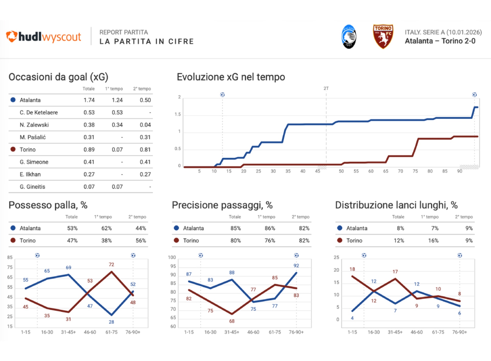La squadra di Palladino ha costruito la propria vittoria a partire da un controllo territoriale netto, emerso con chiarezza già nel primo tempo e confermato dai numeri complessivi della gara. Il 53% di possesso finale, salito al 62% nei primi 45 minuti, non ha raccontato una gestione sterile ma una circolazione funzionale a occupare stabilmente la metà campo del Torino. L’85% dei passaggi completati, contro l’80% dei granata, ha certificato una squadra capace di muovere il pallone con continuità, soprattutto nel terzo offensivo, dove l’Atalanta ha completato il 78% dei passaggi tentati, segnale di pulizia tecnica e corretto posizionamento tra le linee.