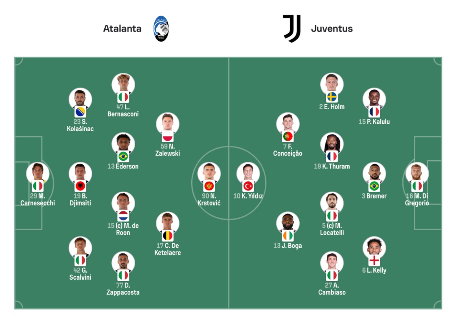 Palladino ha schierato il miglior 3-4-2-1 possibile al netto dell’assenza di Hien, scegliendo di dare continuità all’assetto visto a Lecce. La decisione più significativa è stata quella di lasciare Charles De Ketelaere libero di muoversi alle spalle di Nikola Krstović, senza un secondo riferimento offensivo fisso. Il belga è partito tra le linee, soprattutto nella zona dove ha orbitato principalmente Locatelli, con l’obiettivo di sporcare la prima costruzione bianconera e creare superiorità interna accanto a Nicola Zalewski.