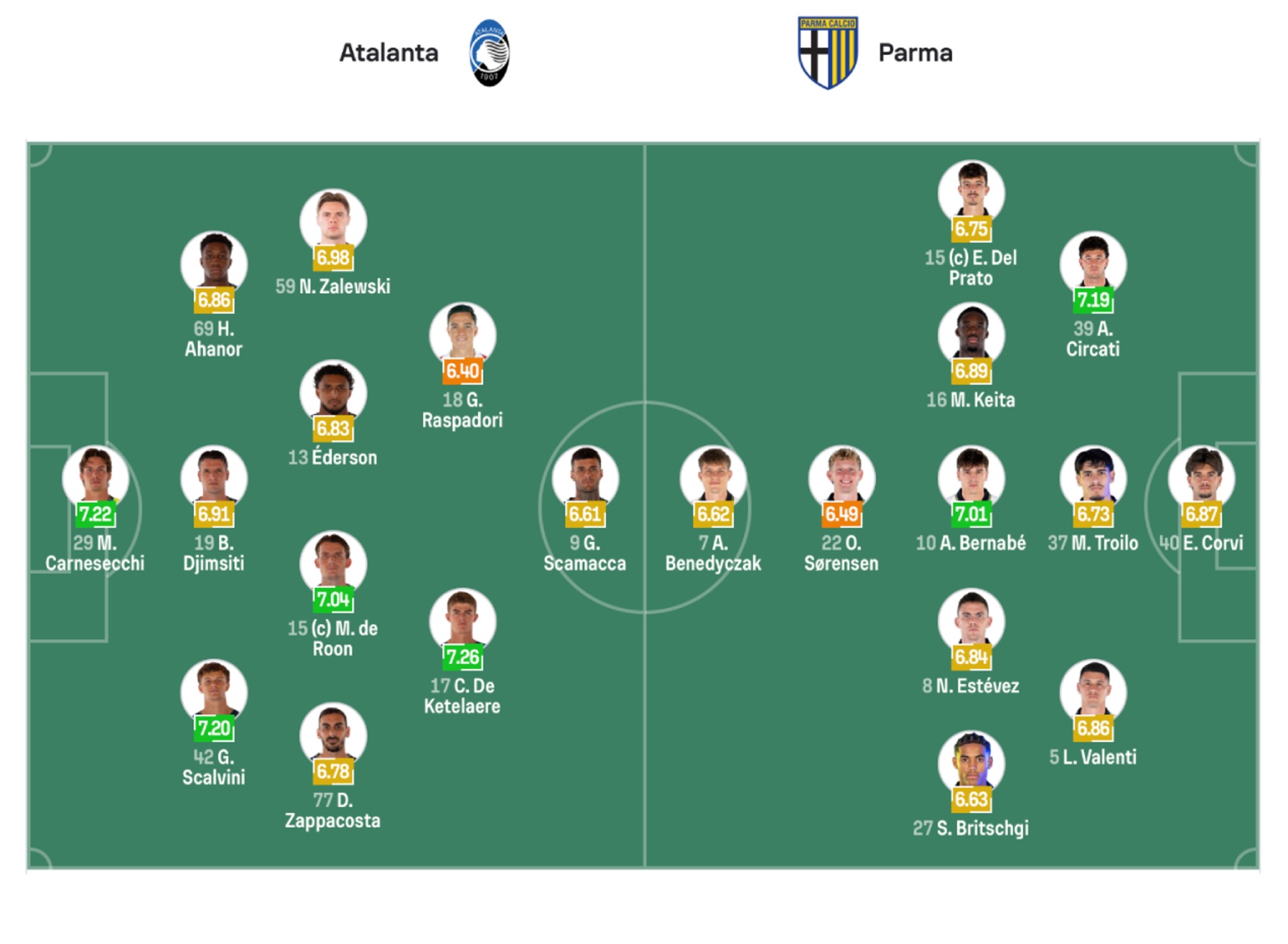 Ad inizio gara Palladino ha confermato il 3-4-2-1, ma con scelte che hanno raccontato chiaramente il momento attraversato dalla squadra. La prima ha riguardato la corsia sinistra, dove Bernasconi è stato inizialmente risparmiato e Zalewski è stato schierato come esterno a tutta fascia. Una decisione legata alla gestione fisica, ma anche alla volontà di aumentare la qualità delle ricezioni interne contro un Parma che in teoria avrebbe difeso basso e orientato a proteggere il centro. Zalewski ha offerto ampiezza pura, ma anche conversioni sul centro al momento opportuno. Le scelte più significative si sono concentrate però nella linea difensiva. Dopo le difficoltà emerse contro il Bilbao, palesate soprattutto da errori individuali commessi dai braccetti. Palladino ha optato per rimettere in campo Scalvini ad Ahanor, confermando invece Djimsiti sul centro, con l’obiettivo di ristabilire riferimenti chiari nei duelli e ridurre il rischio in costruzione.