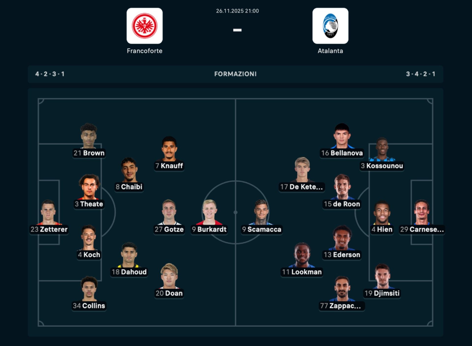 Le scelte iniziali hanno mostrato da subito il quadro tattico con cui i due allenatori hanno immaginato la gara. Il Francoforte si è presentato con il 4-2-3-1 abituale, assetto che ha privilegiato ampiezza e aggressività sulle fasce, con Knauff e Doan pronti a isolarsi contro gli esterni avversari e Burkardt a fissare Hien. La coppia Dahoud-Chaibi ha garantito qualità e letture rapide in zona palla, mentre Götze ha agito tra le linee con l’obiettivo di manipolare la struttura difensiva dell’Atalanta. La scelta di Collins e Brown come terzini ha confermato la volontà di Toppmöller di spingere sugli esterni per giocare duelli aperti. L’Atalanta ha risposto con il 3-4-2-1 di Palladino, schieramento che ha riproposto Scamacca come riferimento avanzato per dare peso e verticalità fin dall’inizio. La presenza contemporanea di De Ketelaere e Lookman alle sue spalle ha suggerito un piano per un gioco più diretto, con la volontà di sfruttare gli half-spaces e la qualità nel primo controllo dei due trequartisti. Sugli esterni Palladino ha confermato Bellanova e Zappacosta, chiamati a dare ampiezza ma anche a contenere la velocità degli esterni tedeschi, mentre De Roon ed Ederson hanno formato la “classica” coppia di equilibrio per proteggere le transizioni. In difesa la scelta di Djimsiti, Hien e Kossounou ha puntato su fisicità, duelli e coperture preventive, consapevole della mobilità dell’attacco tedesco.