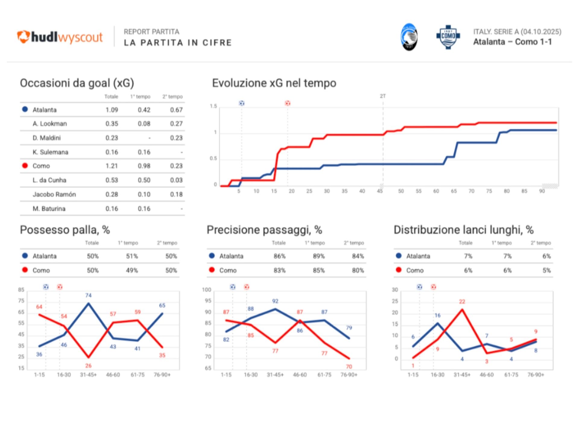 L a sfida tra Atalanta e Como giocata sabato alla New Balance Arena è stata una partita intensa e tatticamente equilibrata. L’Atalanta, ancora segnata dalle assenze, ha iniziato con aggressività, trovando subito il vantaggio con Samardžić dopo una pressione alta ben eseguita. Il Como ha reagito con calma, ha consolidato il possesso e ha raggiunto il pari con Perrone, sfruttando una disattenzione nella costruzione nerazzurra. Da lì in avanti la gara si è assestata su ritmi alti, con due squadre che hanno alternato momenti di dominio territoriale e ripartenze dirette. Nel secondo tempo Fàbregas ha inserito Morata per dare profondità, peso offensivo e cercare la zampata vincente, mentre Juric ha risposto con cambi mirati a ristabilire equilibrio e intensità. L’1-1 finale ha fotografato fedelmente l’andamento del match: equilibrio nel possesso (50%), xG quasi identici (1.09 Atalanta; 1.21 Como) e una sensazione di maturità crescente in entrambe le squadre. L’Atalanta, pur senza vincere, ha mostrato solidità e progressi evidenti, confermando come il lavoro di Juric stia cominciando a dare forma e riconoscibilità alla nuova identità dei nerazzurri.