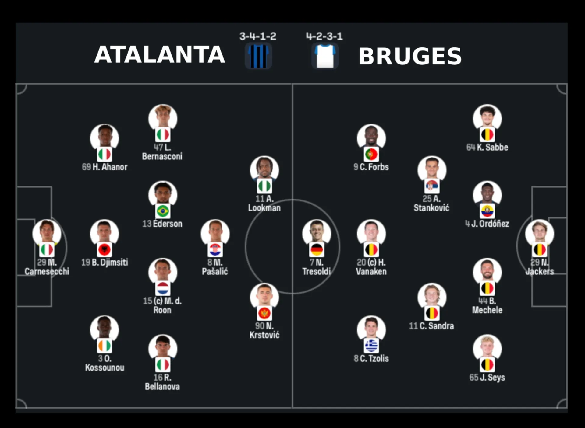 L’Atalanta ha affrontato il Brugge con il 3-4-1-2 e con Lookman rientrato accanto a Krstović, mentre Pašalić ha agito tra le linee. Sulle corsie esterne hanno trovato spazio Bellanova e Bernasconi (ottima la sua prova) ormai promosso a laterale sinistro”di coppa”. Ederson e de Roon sono tornati a formare la coppia di mediana. Hayen ha risposto a Juric schierando il Brugge con un 4-2-3-1, con Vanaken alle spalle di Tresoldi e gli esterni Forbs e Tzolis pronti a correre in transizione. La linea difensiva a quattro era formata da Sabbe, Ordoñez, Mechele e Seys, e protetta da Stankovic. In porta Jackers, ha sostituito il titolare Mignolet, indisponibile. La scelta di Juric hanno puntato (almeno nelle intenzioni) su ampiezza e attacchi diretti, mentre Hayen ha protetto il centro con Stanković e Sandra e ha cercato profondità immediata sugli esterni. La partita si è sviluppata su questo equilibrio, con l’Atalanta che ha provato a consolidare possesso e riaggressione, e con il Brugge che ha difeso basso e creato pericoli nelle ripartenze, e ha utilizzato la gestione della palla per far correre a vuoto i nerazzurri.